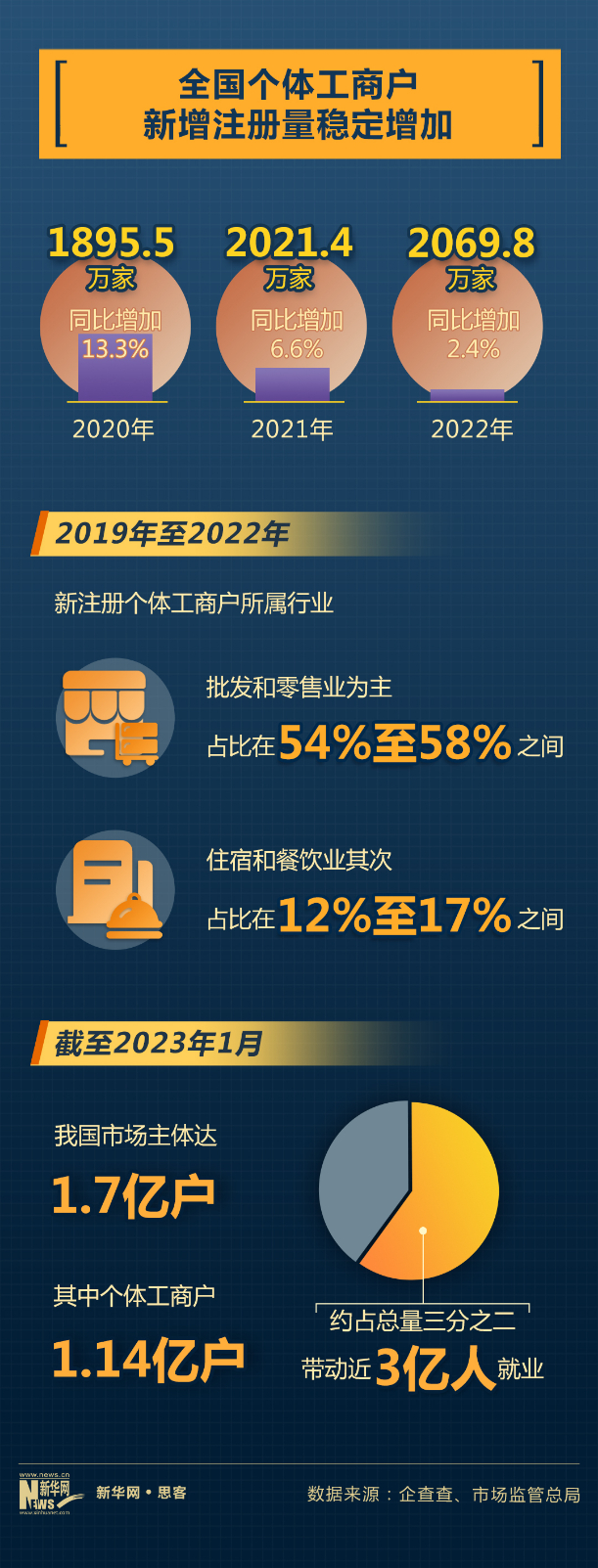 近日市場監管總局統計顯示,截至2023年1月,我國市場主體達1.7億戶,其中個體工商戶1.14億戶,約占總量三分之二,帶動近3億人就業。
