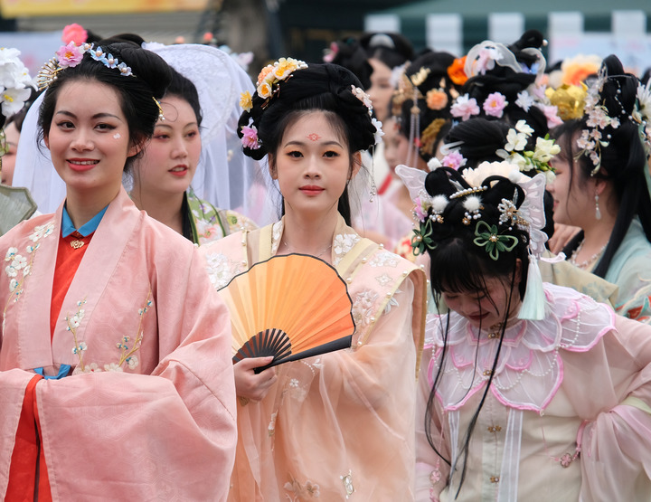 3月18日,身著古風服飾的人們在廣西南寧園博園參加花朝盛典活動。新華社記者 周華 攝