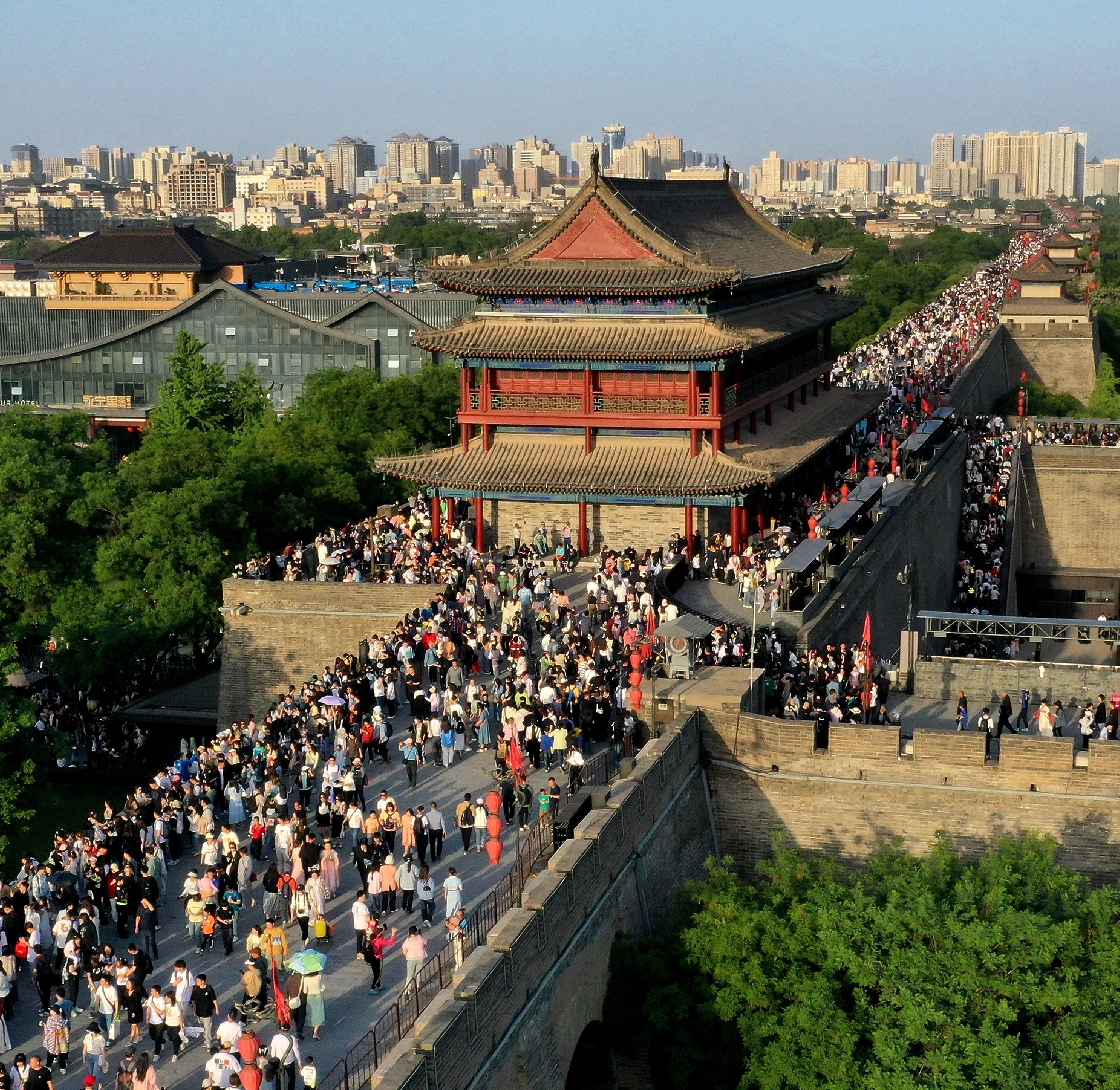 游客在西安城墻景區參觀游覽(4月30日攝,無人機照片)。新華社記者 劉瀟 攝