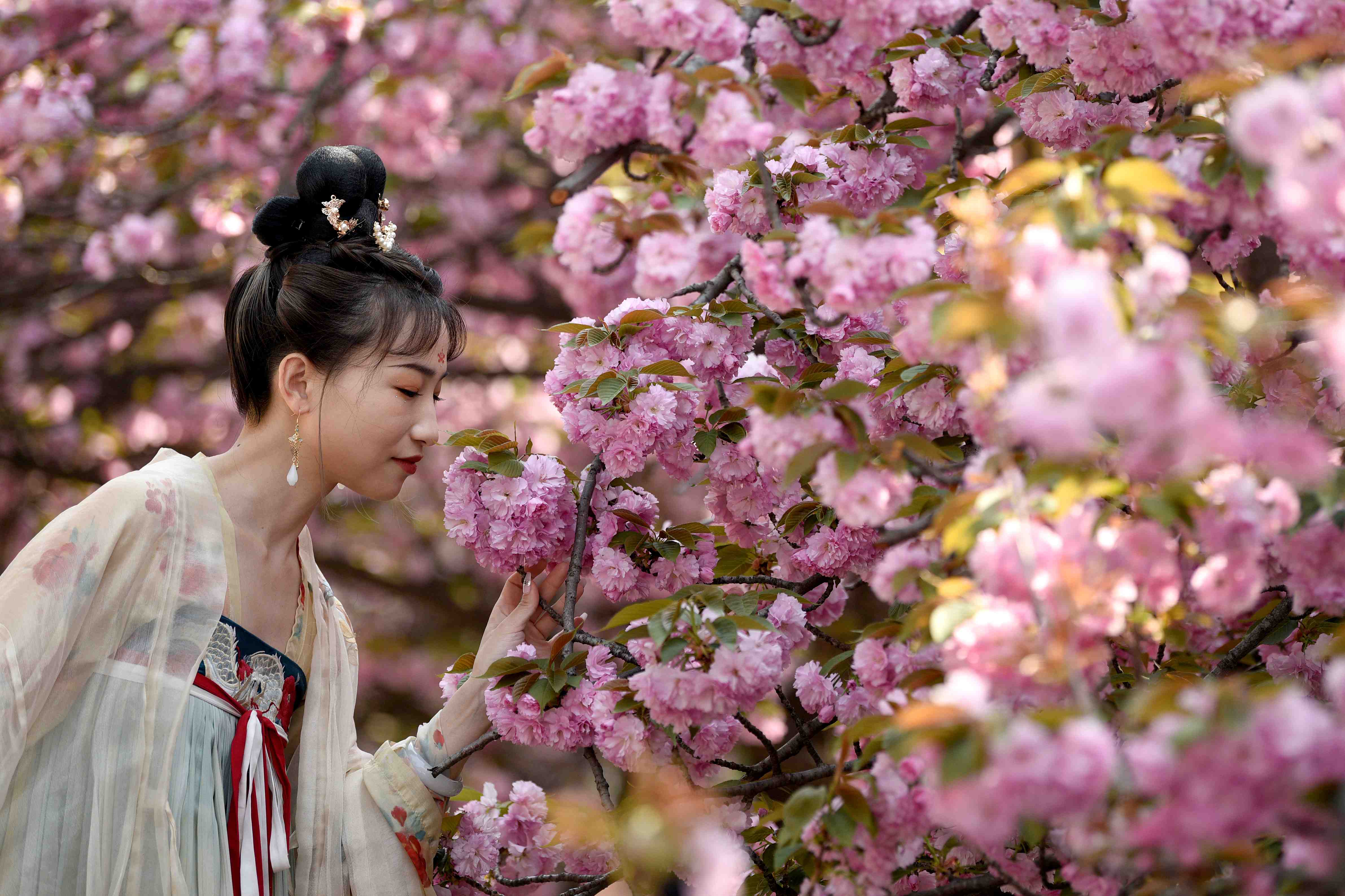 在位于樂游原的青龍寺遺址景區內,國風愛好者在賞花游覽(3月31日攝)。新華社記者 劉瀟 攝