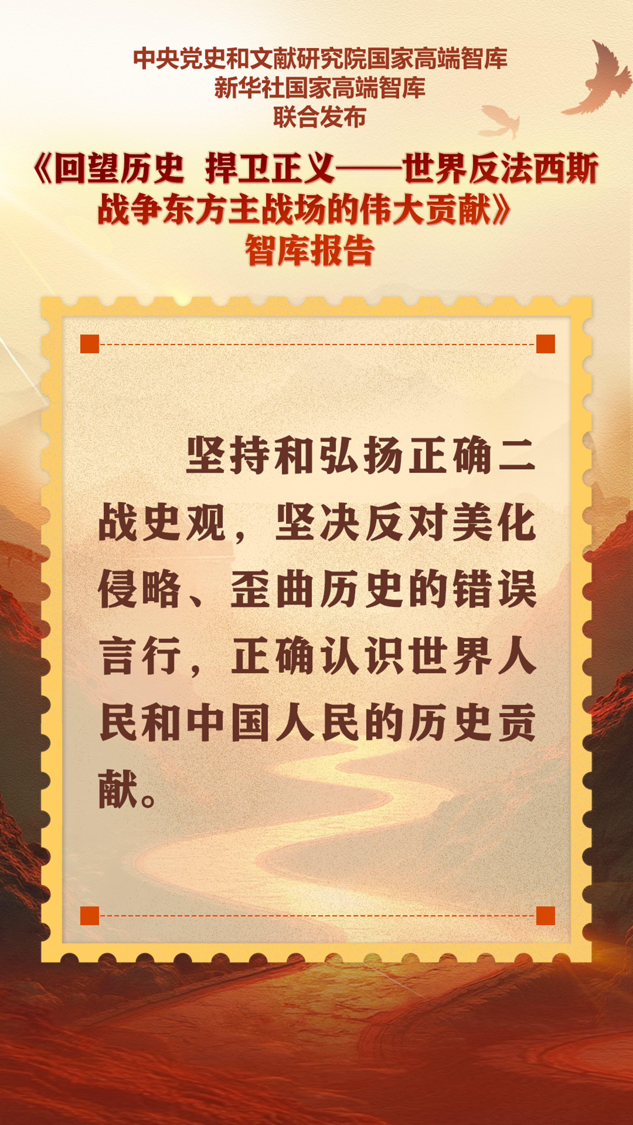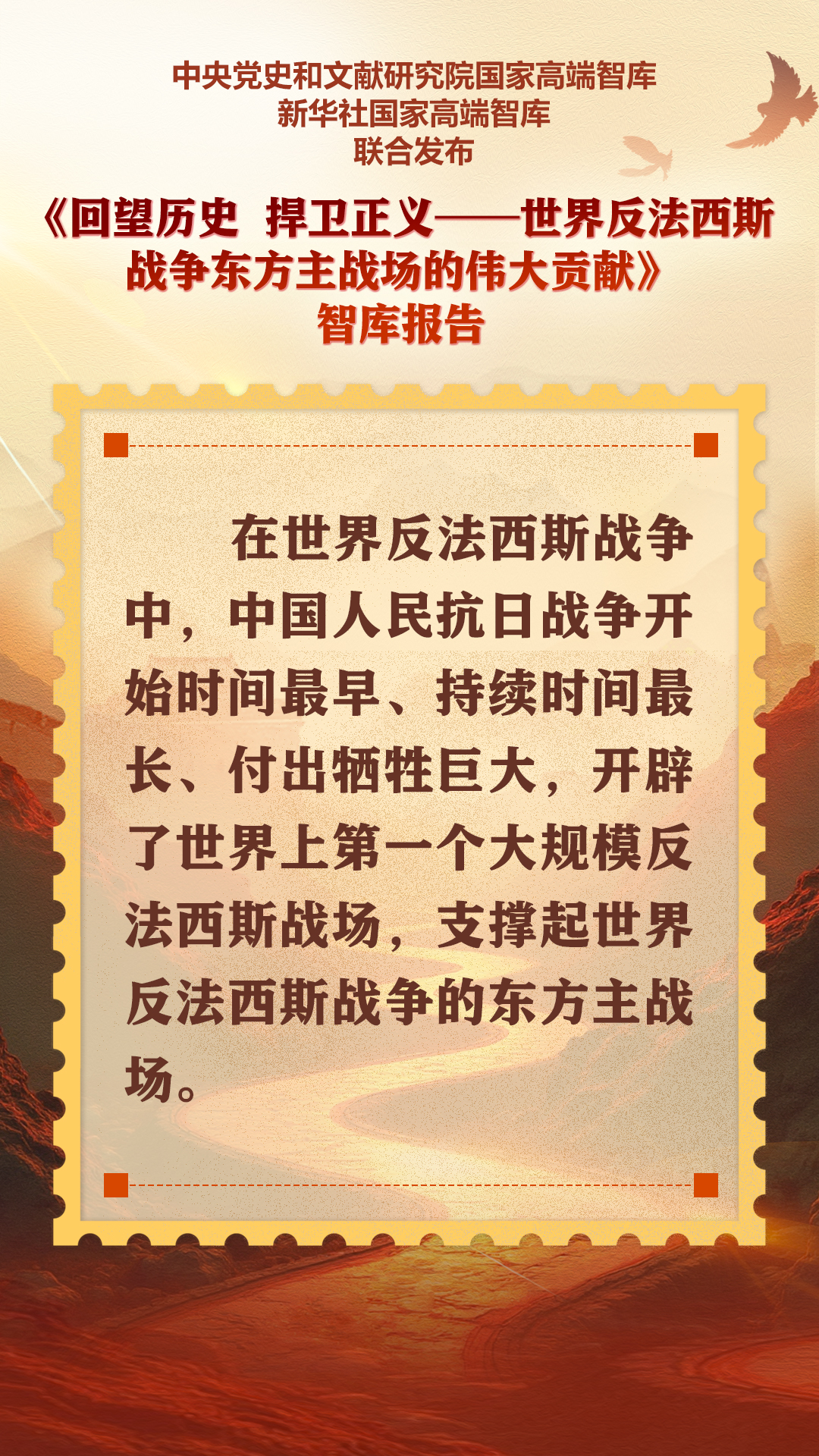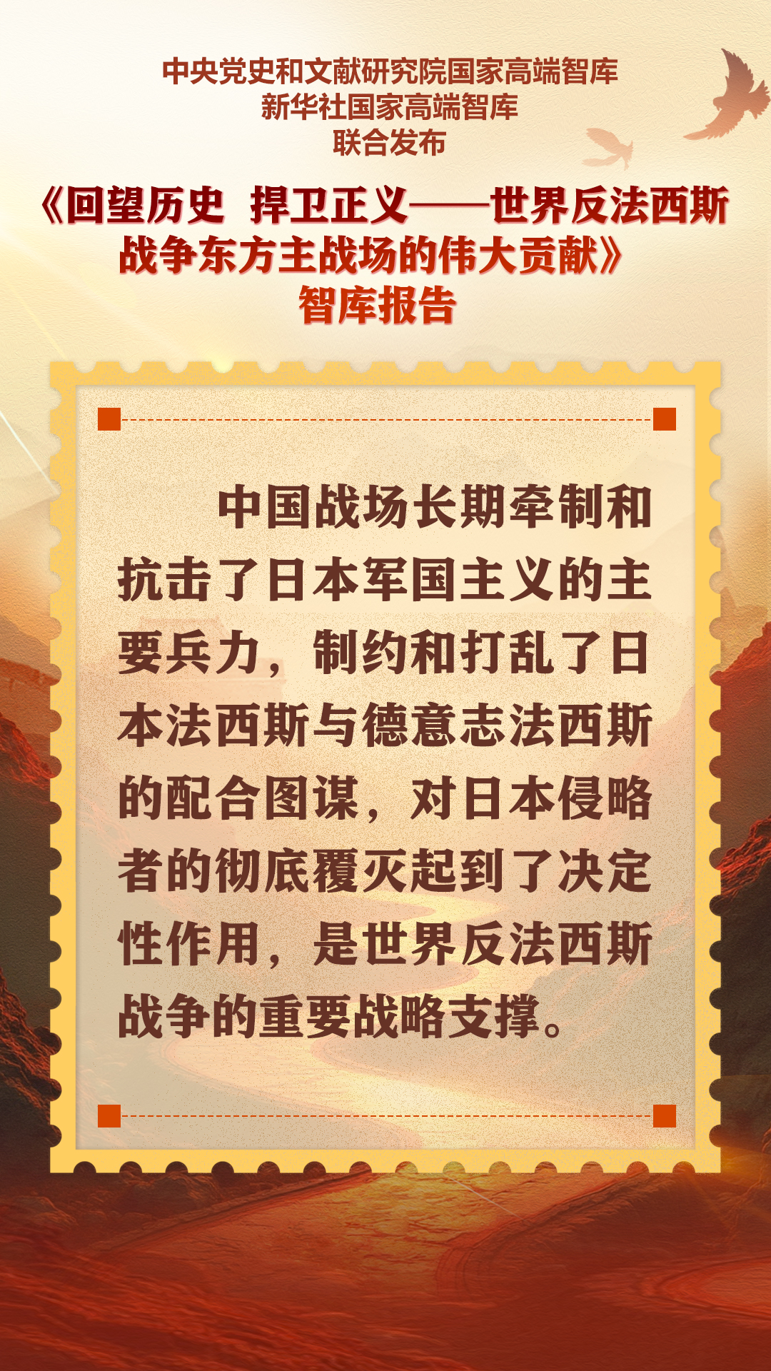 9月5日,中央黨史和文獻研究院國家高端智庫、新華社國家高端智庫聯合打造的《回望歷史 捍衛正義——世界反法西斯戰爭東方主戰場的偉大貢獻》智庫報告在北京發布。