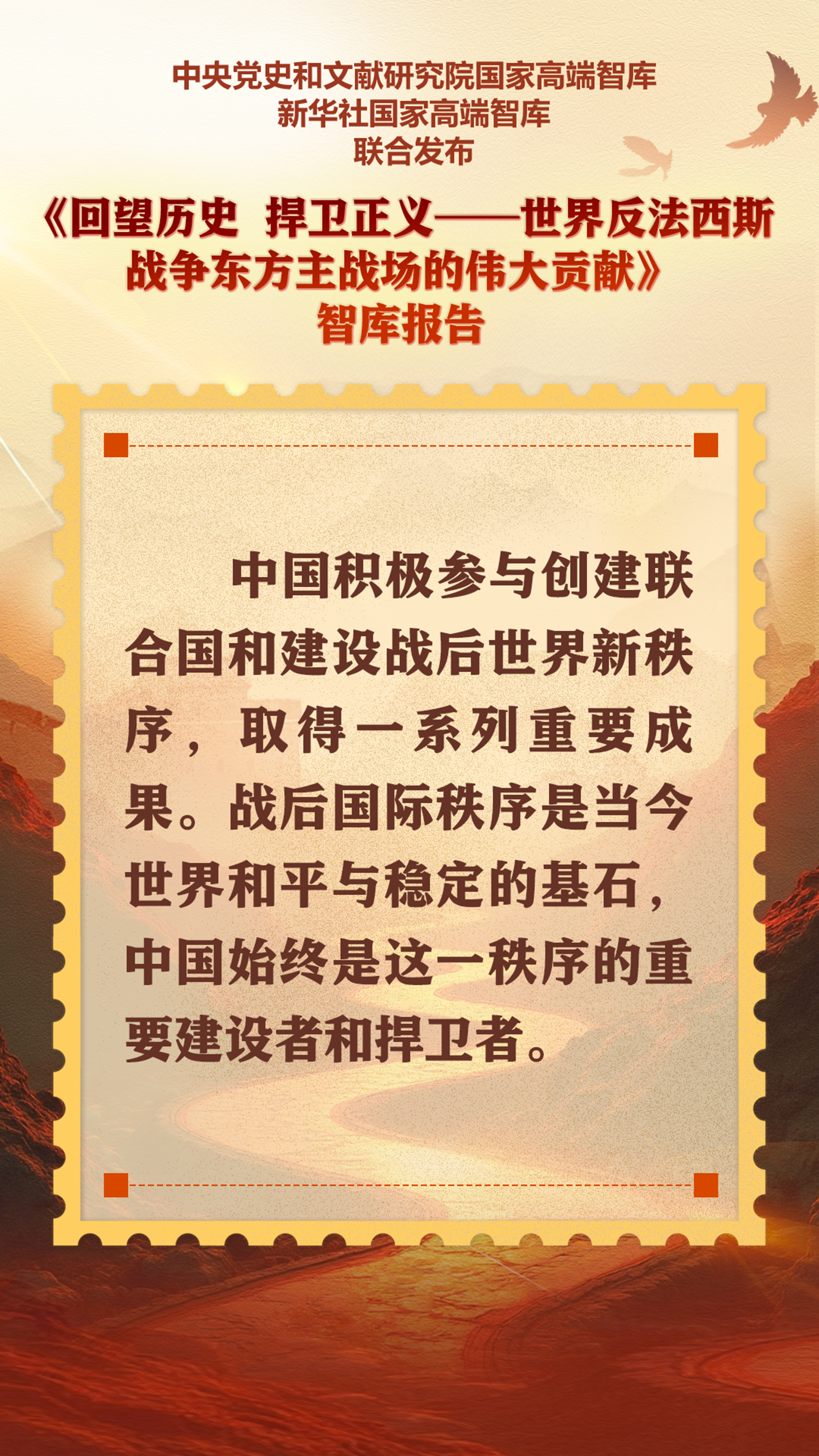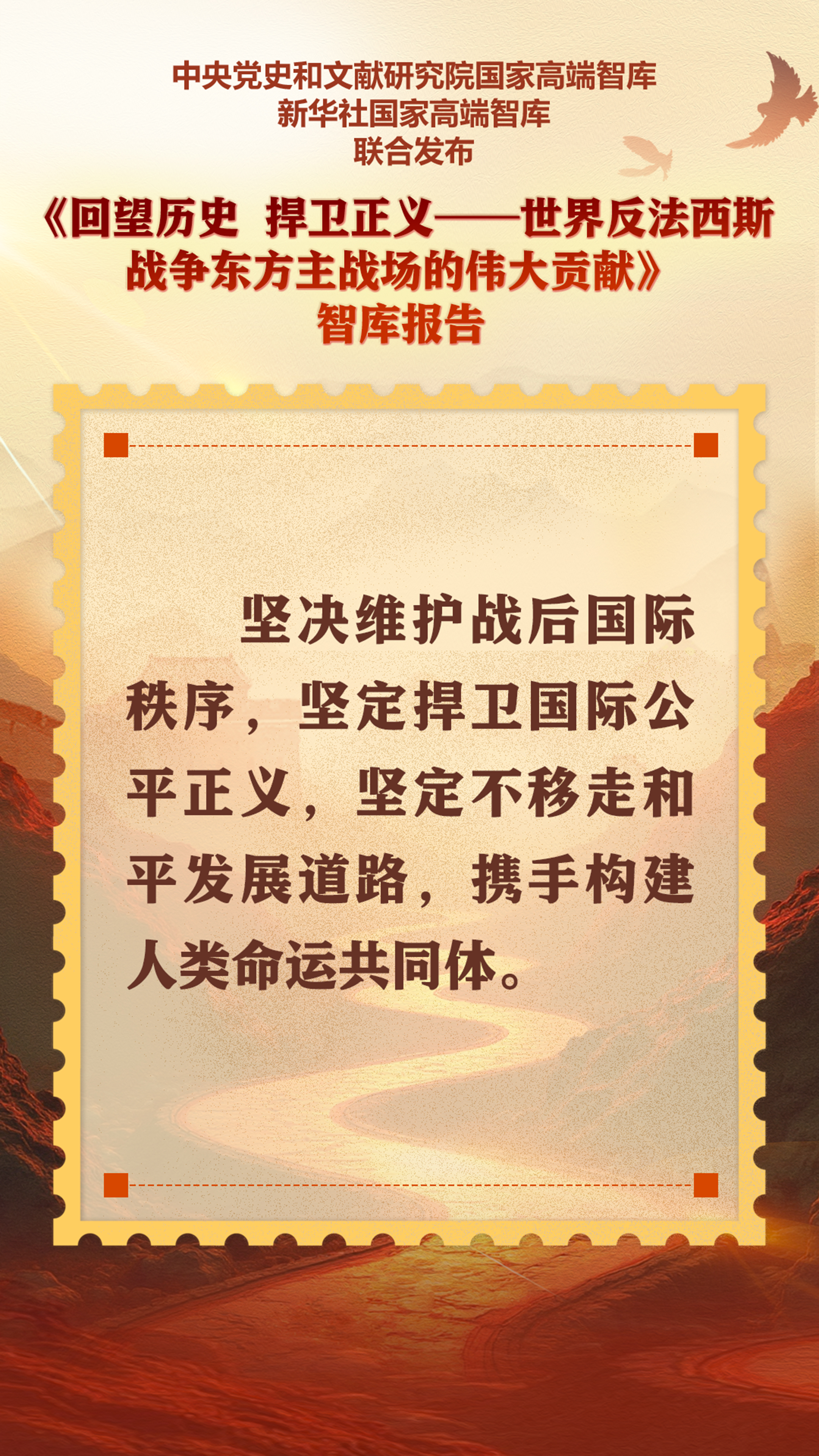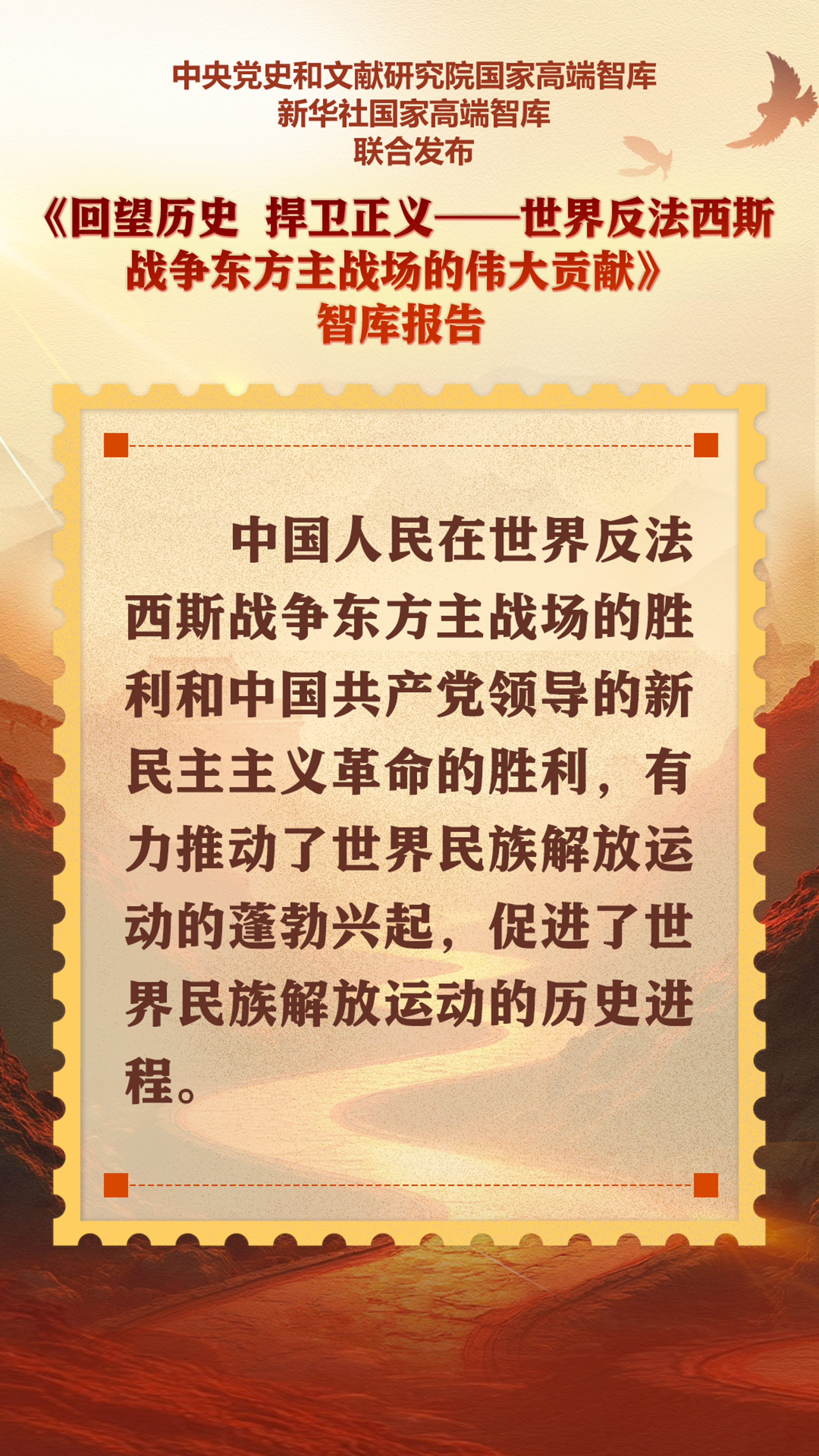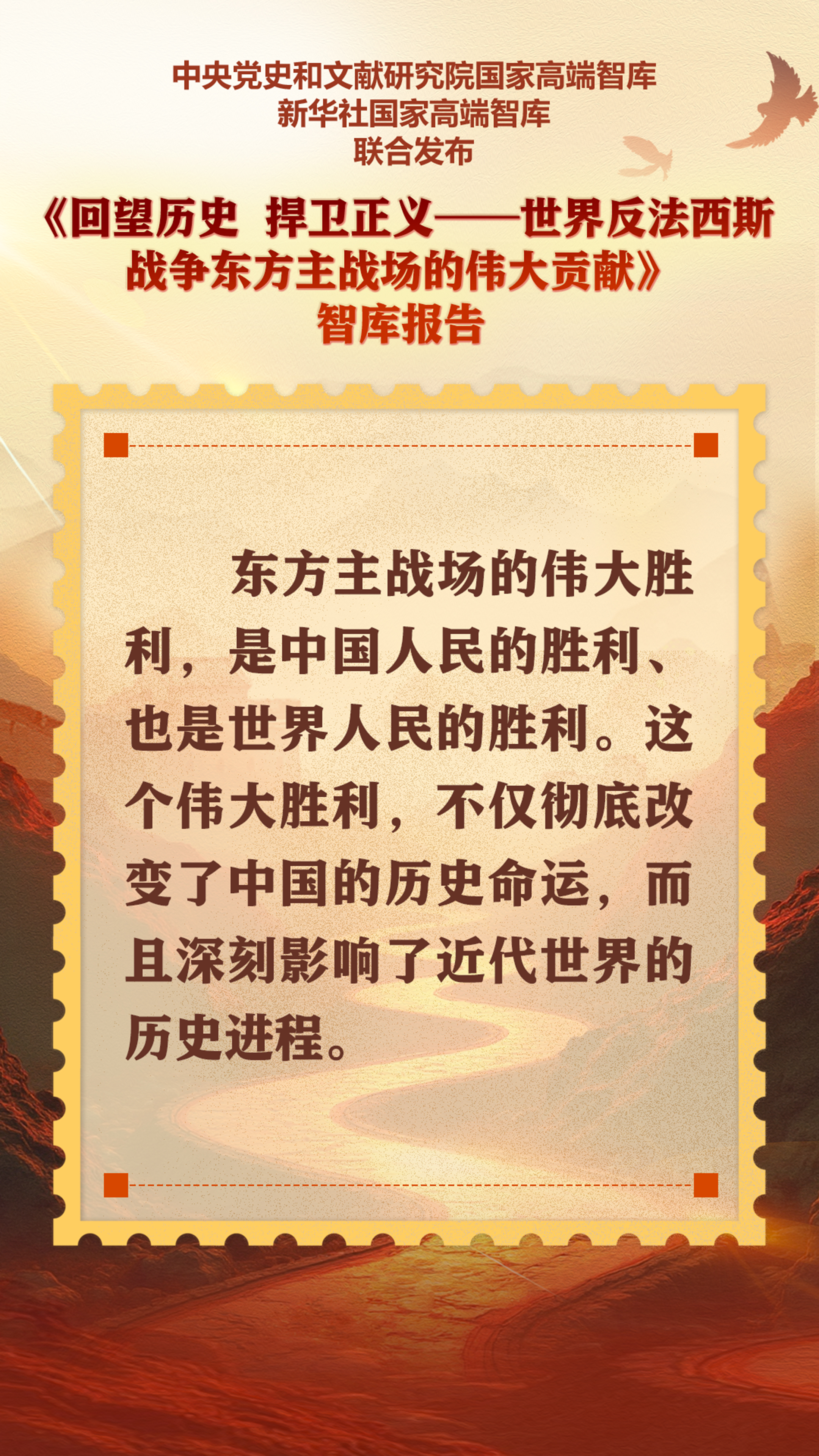 9月5日,中央黨史和文獻研究院國家高端智庫、新華社國家高端智庫聯合打造的《回望歷史 捍衛正義——世界反法西斯戰爭東方主戰場的偉大貢獻》智庫報告在北京發布。