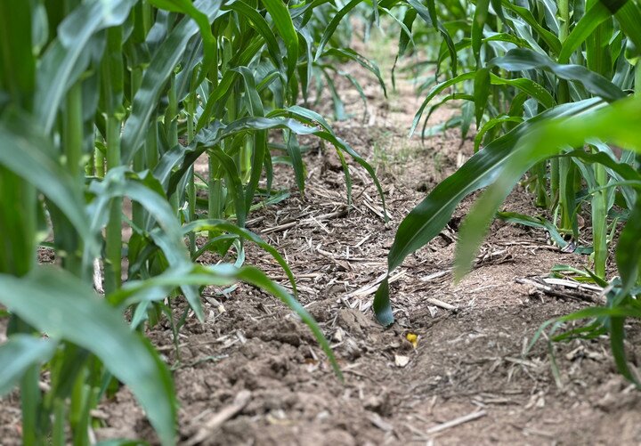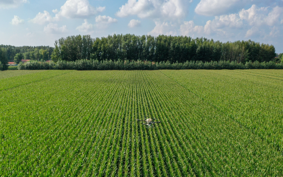 7月21日,在位于吉林省四平市梨樹縣的“科技小院”試驗田,植保無人機為玉米精準施肥(無人機拍攝)。新華社記者 張楠 攝
