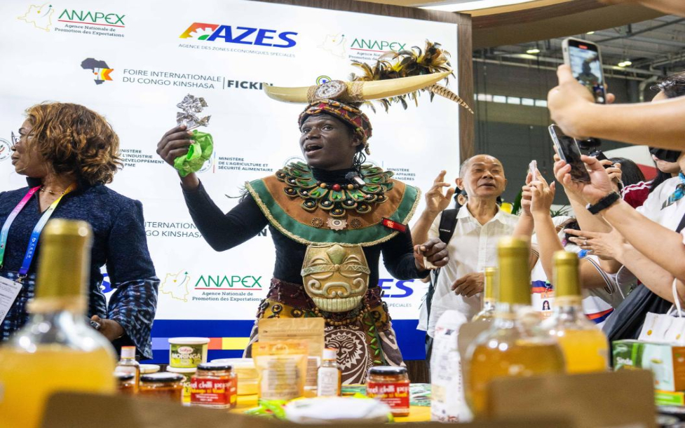 6月13日,在長沙國際會展中心,參展商(左二)向觀眾介紹非洲商品。 新華社記者 陳思汗 攝