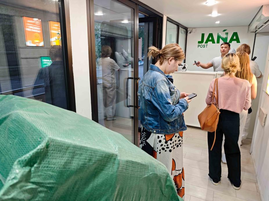 5月25日,在哈薩克斯坦阿拉木圖,人們在一家主要負責中國網購平臺物流服務的快遞網點排隊等待自提。新華社記者 李任滋 攝