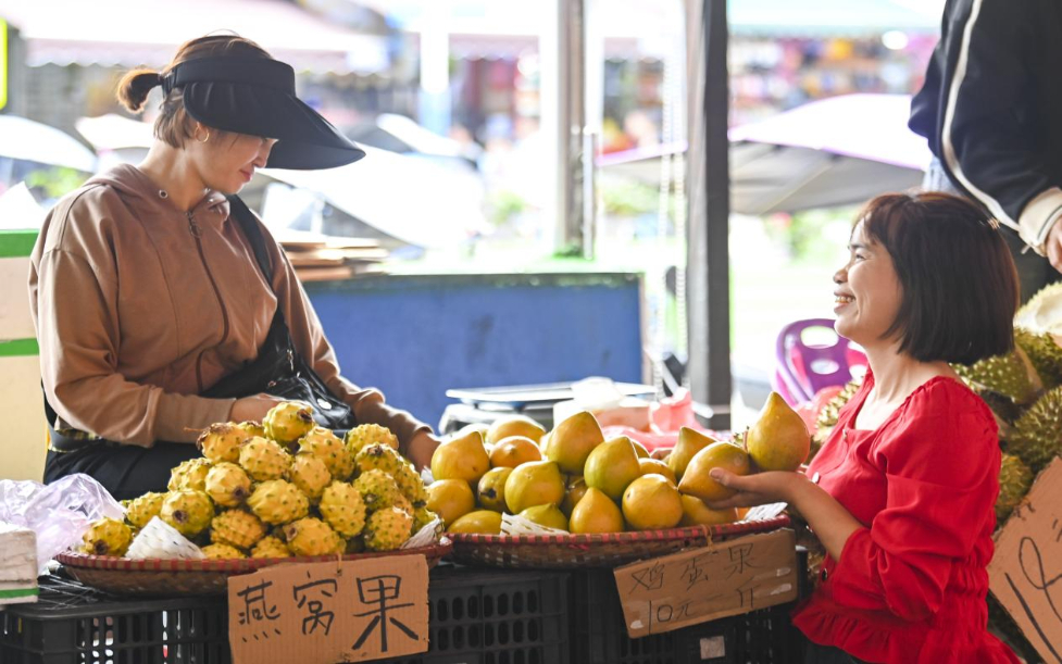 4月17日,在廣西東興口岸附近的一處水果市場,顧客在選購進口水果。新華社記者 曹祎銘 攝