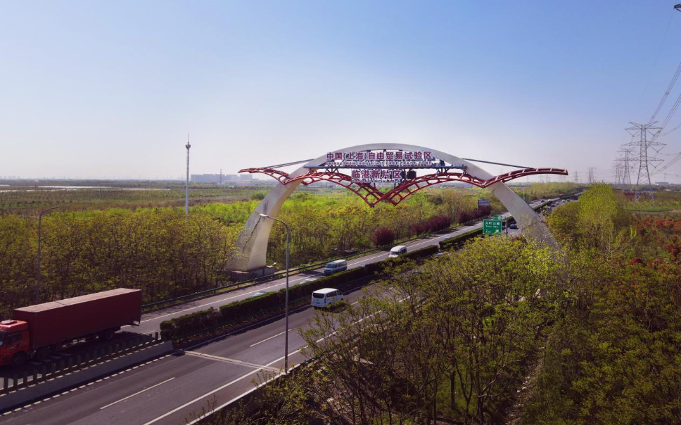 2025年4月15日拍攝的位于滬蘆高速公路上的上海自貿試驗區臨港新片區的標志“海鷗門”(無人機照片)。新華社記者 方喆 攝