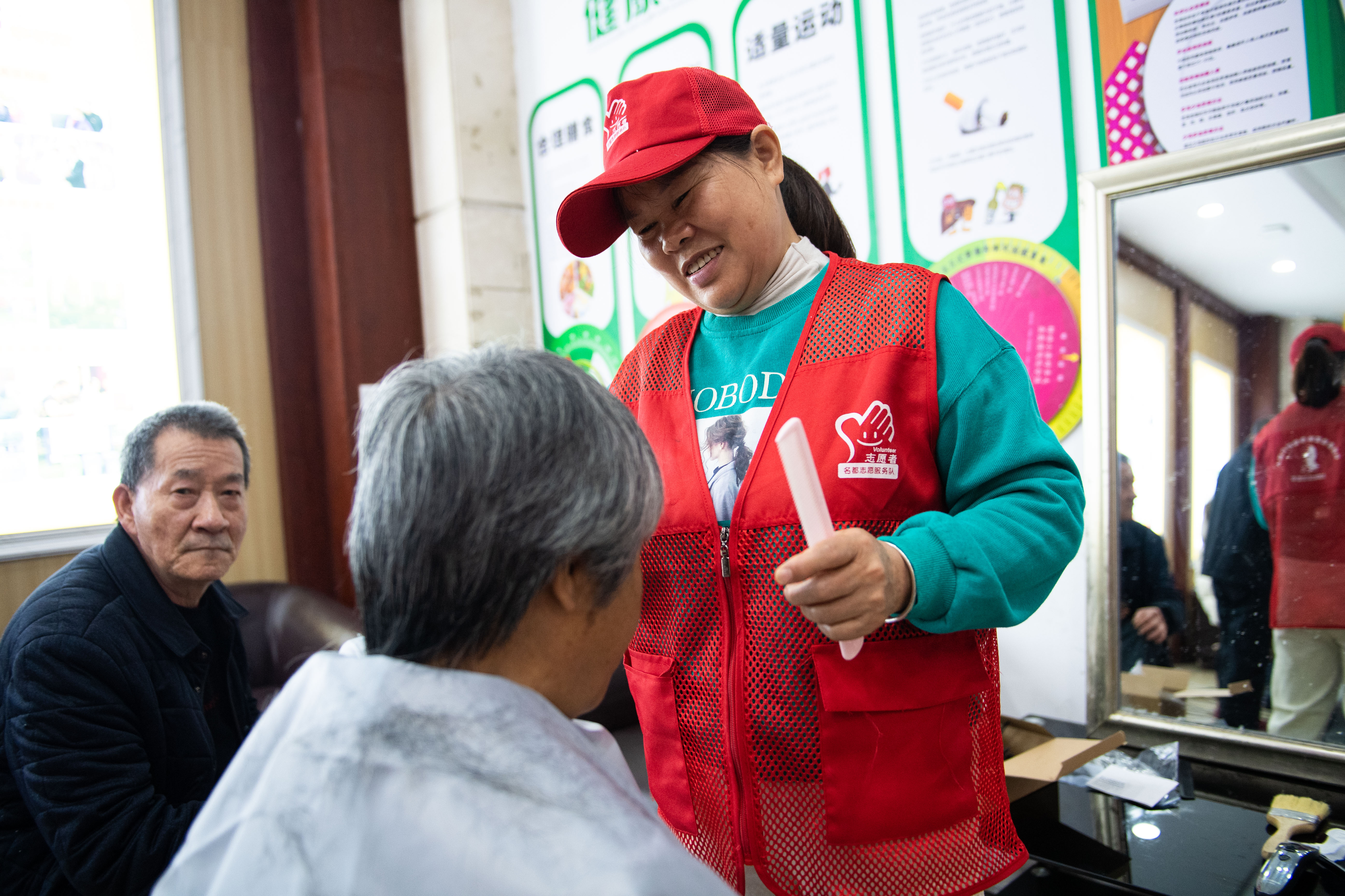2021年4月21日,在望城名都社區公共服務大廳,志愿者陸君給鄰居免費剪頭發。新華社記者 陳思汗 攝