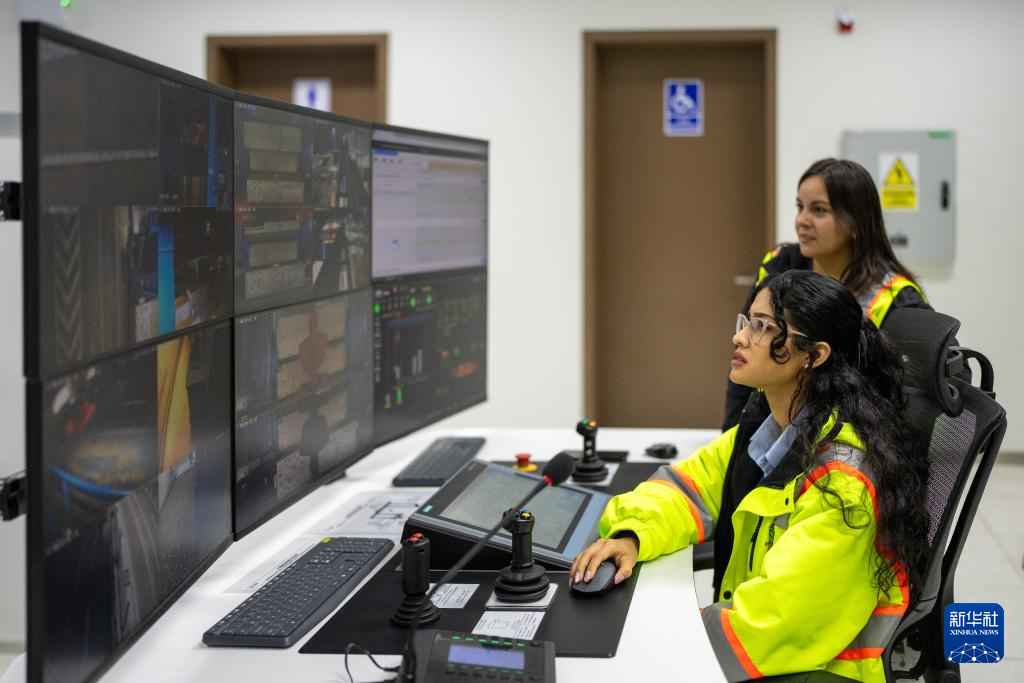 記者在碼頭看到,自動化軌道吊精準運作,智能駕駛集裝箱卡車來回穿行,數字孿生技術實時呈現作業動態,秘魯青年坐在中控室遠程操控機械臂精準抓取集裝箱……