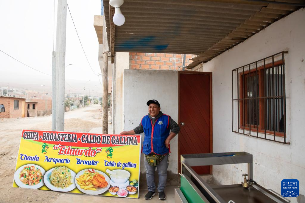 8月14日,在位于秘魯首都利馬城區以北的阿斯普羅丹社區,當地居民愛德華多·坎查諾展示他的美食招牌。新華社發(瑪麗安娜·巴索攝)