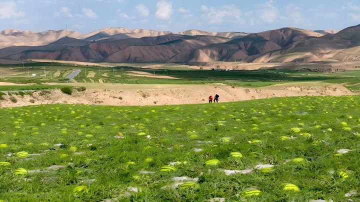 農戶在中衛市沙坡頭區香山鄉硒砂瓜瓜田勞作。新華社記者 王鵬 攝