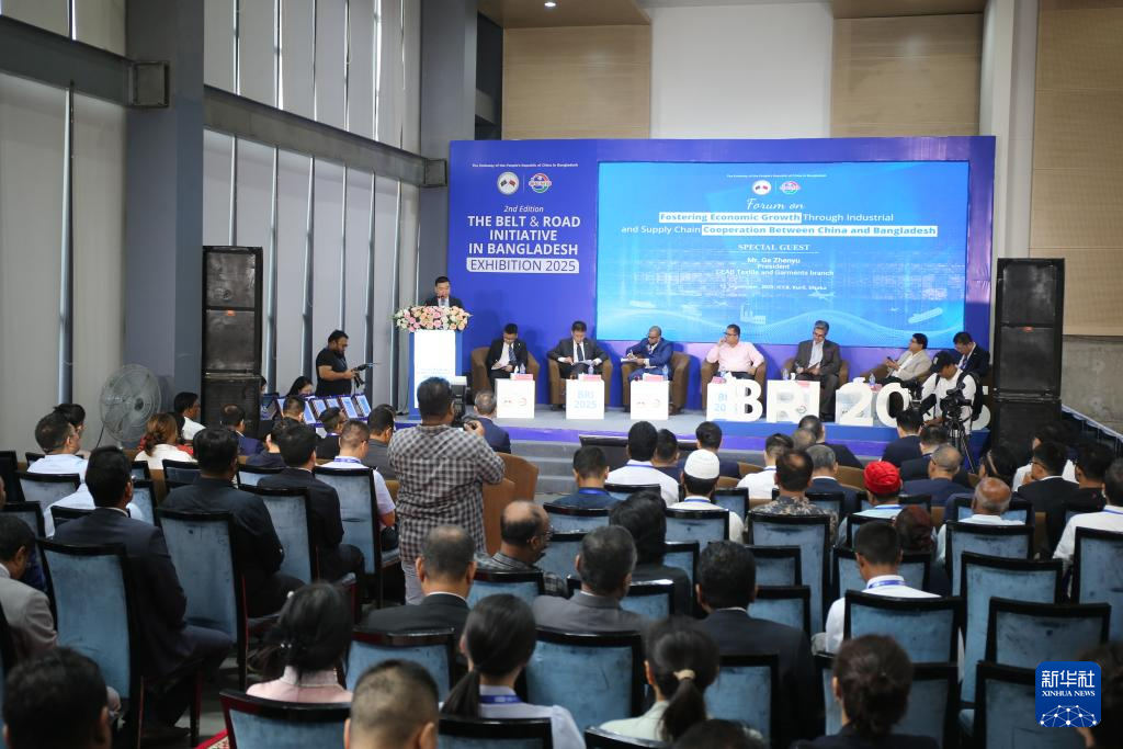 這是9月12日在孟加拉國首都達卡拍攝的“2025‘一帶一路’倡議在孟加拉國”展會期間舉辦的主題論壇現場。新華社發(哈比卜·拉赫曼攝)