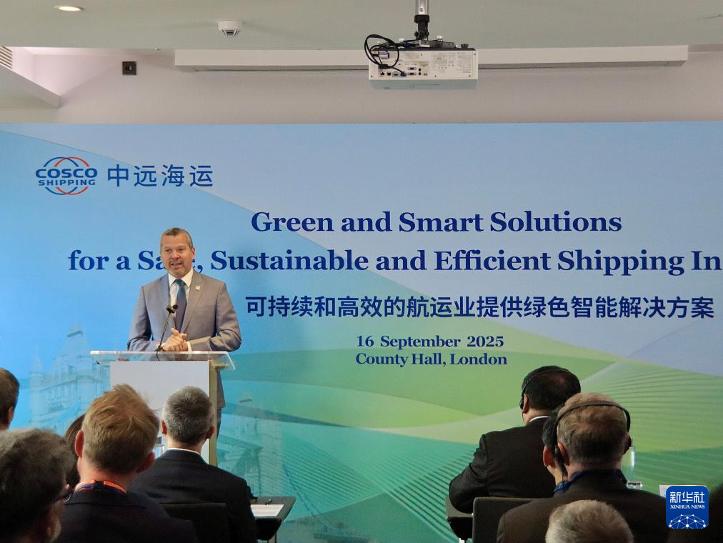 9月16日,在英國倫敦舉行的“為安全、可持續和高效的航運業提供綠色智能解決方案”主題論壇上,國際海事組織秘書長阿塞尼奧·多明戈斯發表致辭。新華社發(馬宇葳攝)