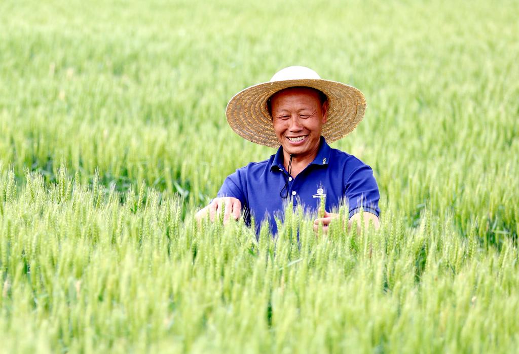5月5日,山東省臨沂市郯城縣郯城街道陵坡村村民在田間查看小麥長勢。新華社發(張春雷攝)