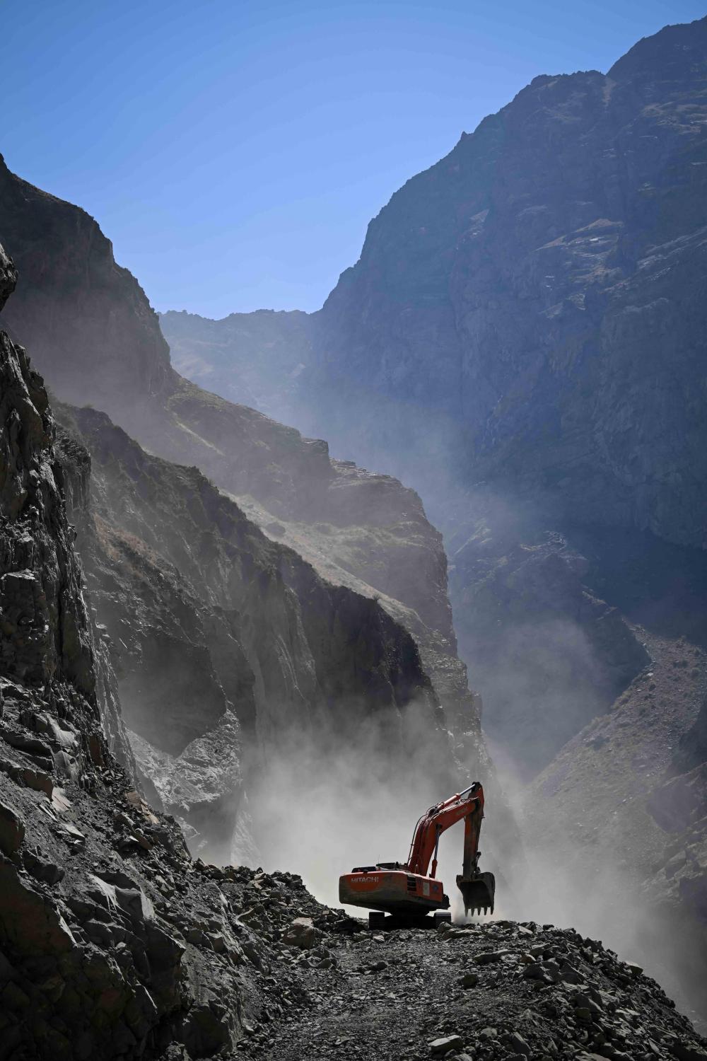 這是在塔吉克斯坦卡拉依洪姆村附近拍攝的中塔公路二期工程施工現場。