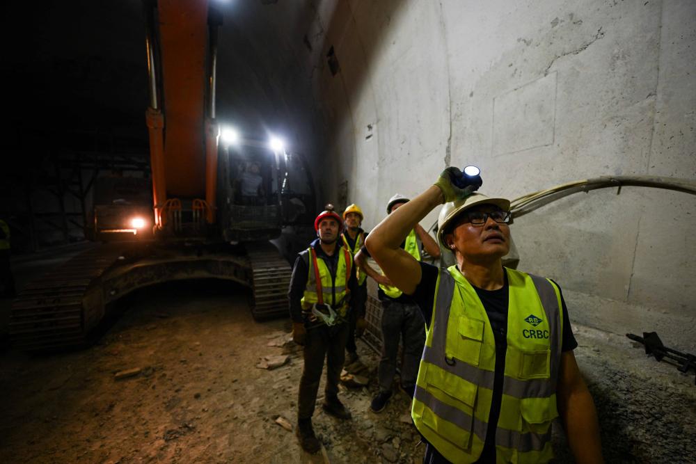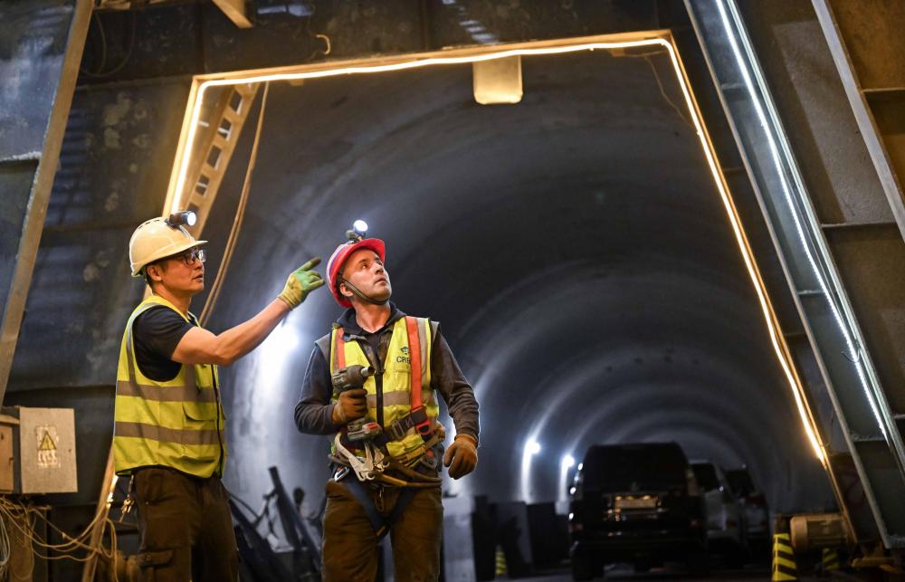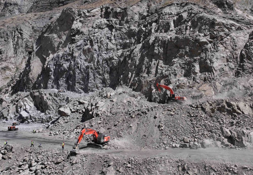 工人在塔吉克斯坦卡拉依洪姆村附近的中塔公路二期工程1號隧道施工現場工作。