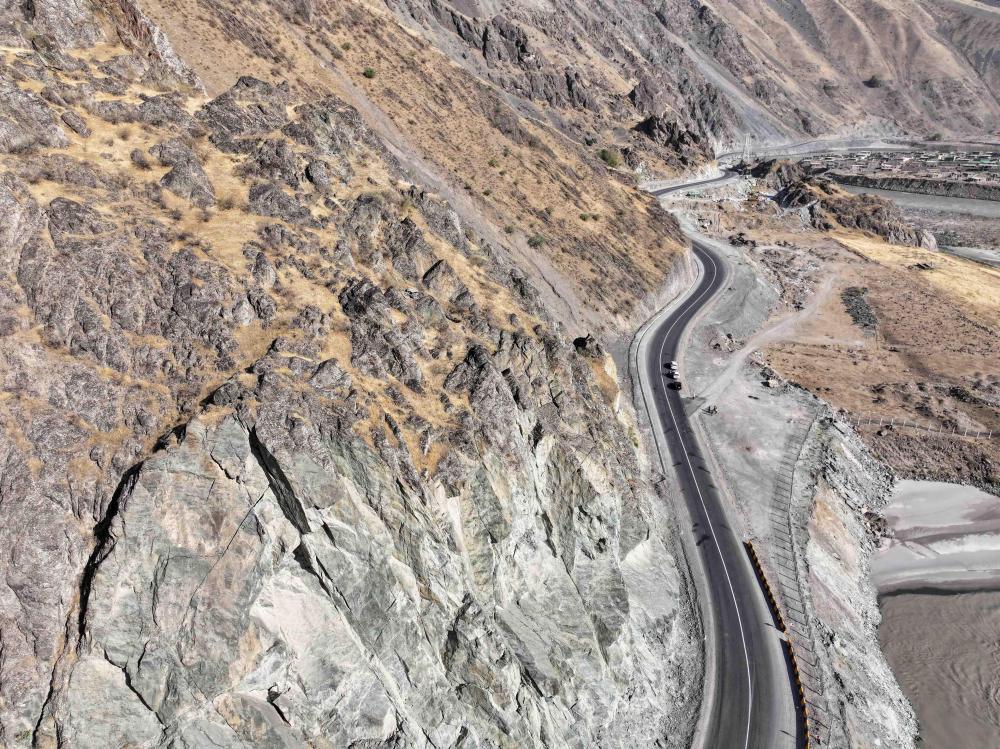 這是在塔吉克斯坦卡拉依洪姆村附近拍攝的中塔公路二期路段(無人機照片)。