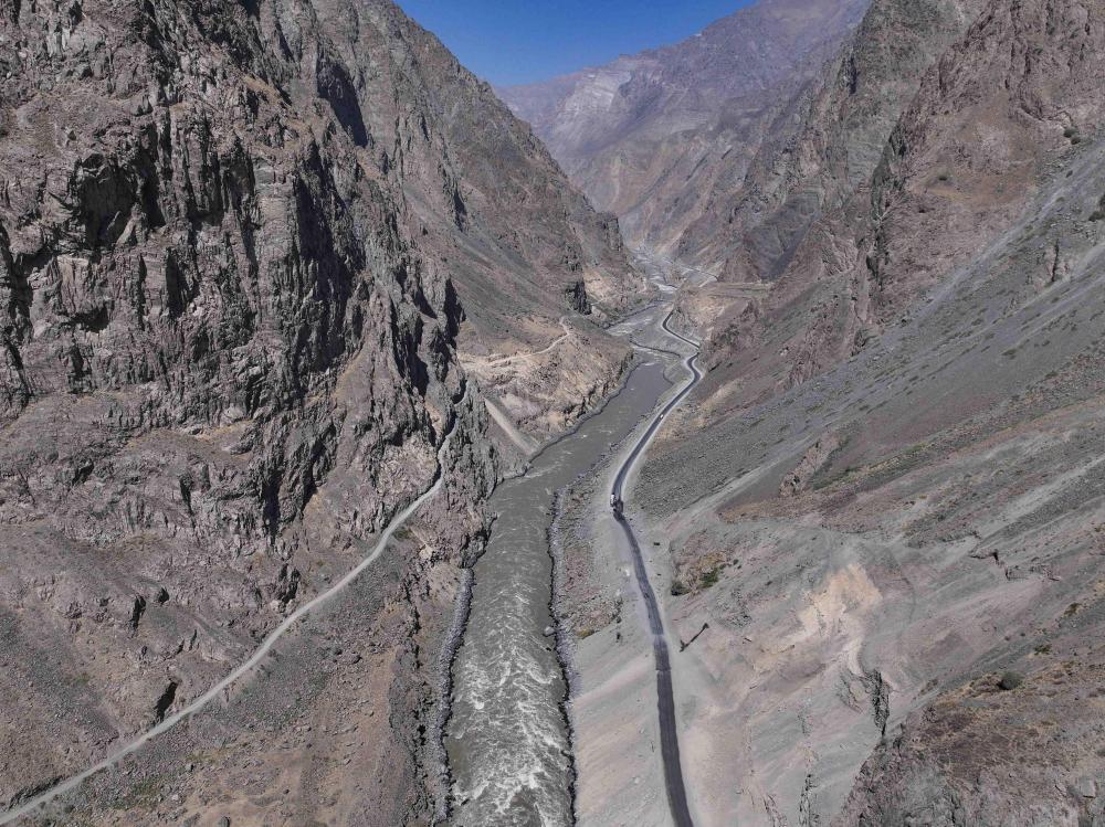 噴赤河奔涌激蕩,晝夜咆哮,兩岸山勢崢嶸,峰巒疊嶂。畫面左側是阿富汗境內(無人機照片)。
