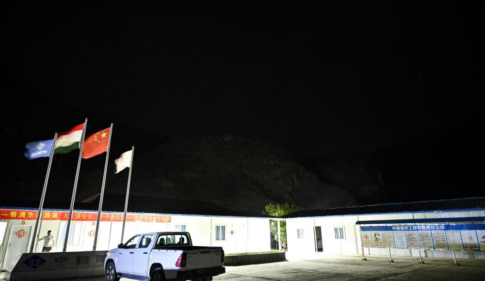 夜幕降臨,中國路橋基地里豎立的中塔兩國國旗格外醒目。