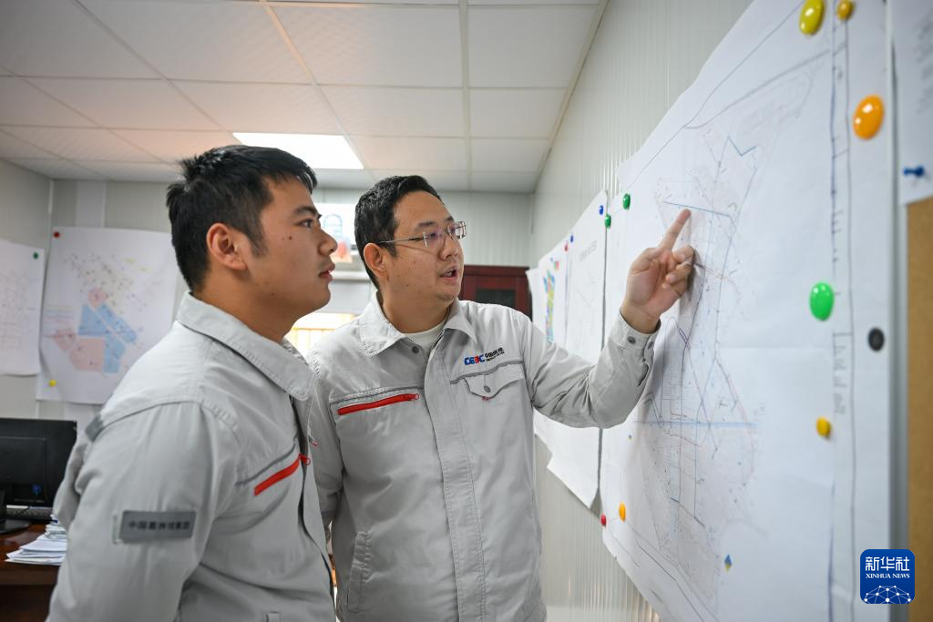 2025年9月9日,在科威特阿卜杜拉新城項目地,中國能建葛洲壩集團員工查看項目規劃圖。