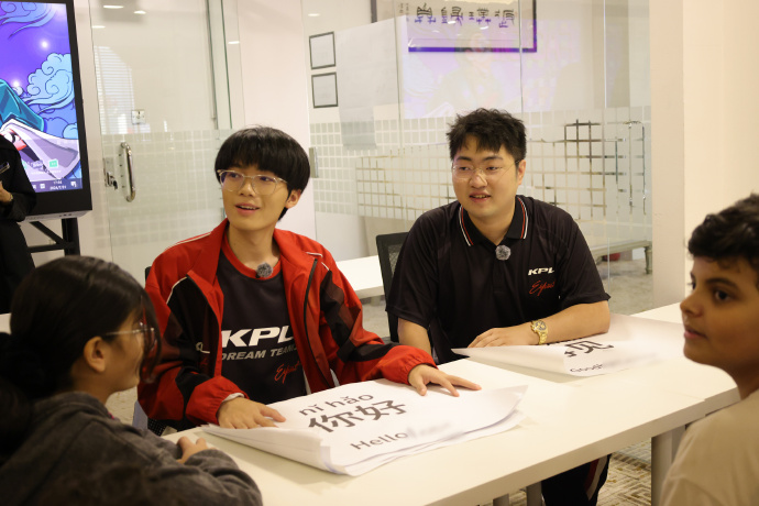 與其他國際隊伍選手打乒乓球互動也成了KPL夢之隊訓練和比賽之余最愛參與的活動之一。除此之外,吳金翔(ID:清清)與教練唐田(ID:愛思)在沙特智慧宮國際中文教育利雅得學院參與交流;陳正正(ID:Cat)與東歐戰隊選手線下進行solo賽;李達亨(ID:小胖)、黃垚欽(ID:清融)、周詣濤(ID:釬城)等隊員在場館交流區學習阿拉伯語;賽前賽后楊濤(ID:無畏)、李達亨(ID:小胖)和其他隊員們都大方展示英語……借助電子競技這樣快樂的交流每天都在發生。