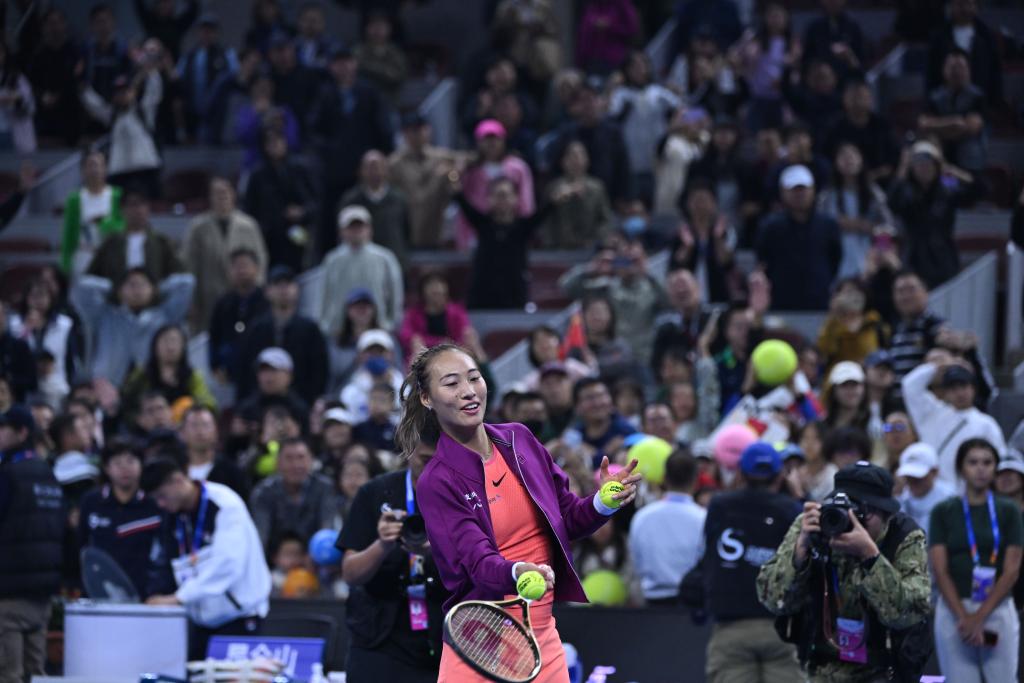 10月4日,鄭欽文在中網女單四分之一決賽后向球迷贈送簽名網球。新華社記者 張龍 攝