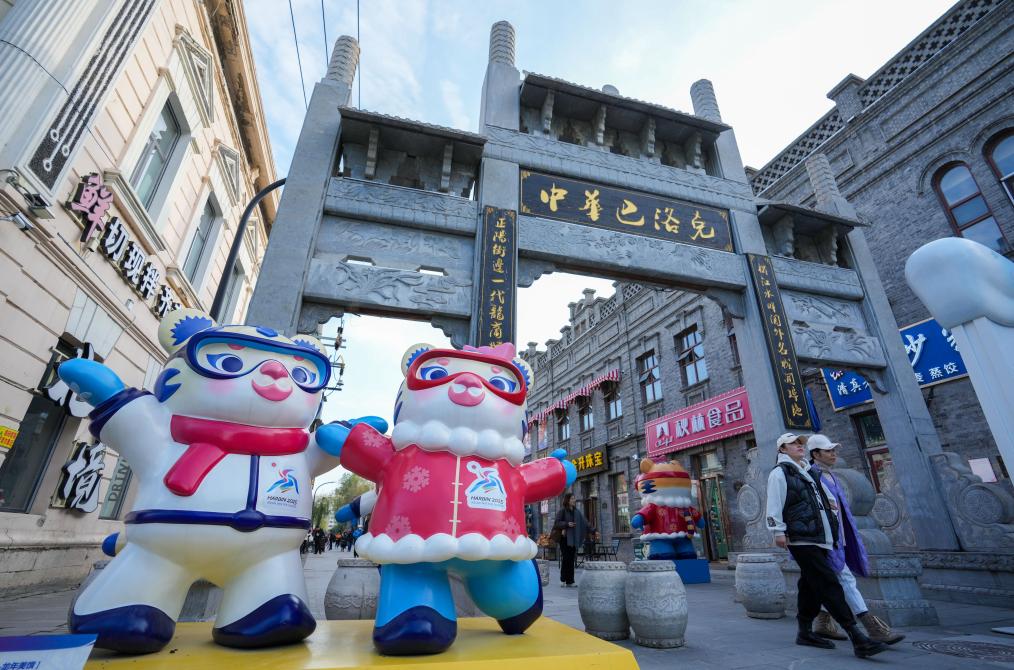 在哈爾濱中華巴洛克歷史文化街區,游客從亞冬會吉祥物雕塑旁走過。2025年第九屆亞洲冬季運動會將于2025年2月7日開幕。新華社記者 王建威 攝