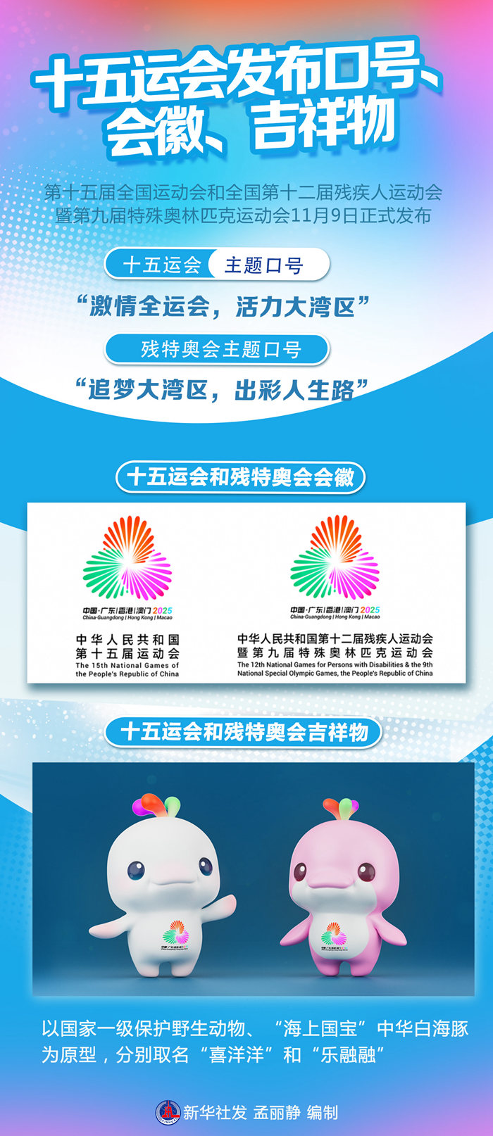 新華社廣州11月9日電(記者王浩明)第十五屆全國運動會和全國第十二屆殘疾人運動會暨第九屆特殊奧林匹克運動會9日正式發布主題口號、會徽、吉祥物。十五運會主題口號為“激情全運會,活力大灣區”,殘特奧會主題口號為“追夢大灣區,出彩人生路”。