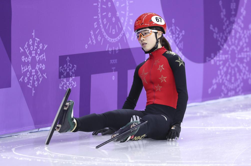 2018年2月13日 ,中國選手曲春雨在平昌冬奧會短道速滑女子500米半決賽中摔倒后滑到場邊。她被判犯規無緣決賽。新華社記者 韓巖 攝