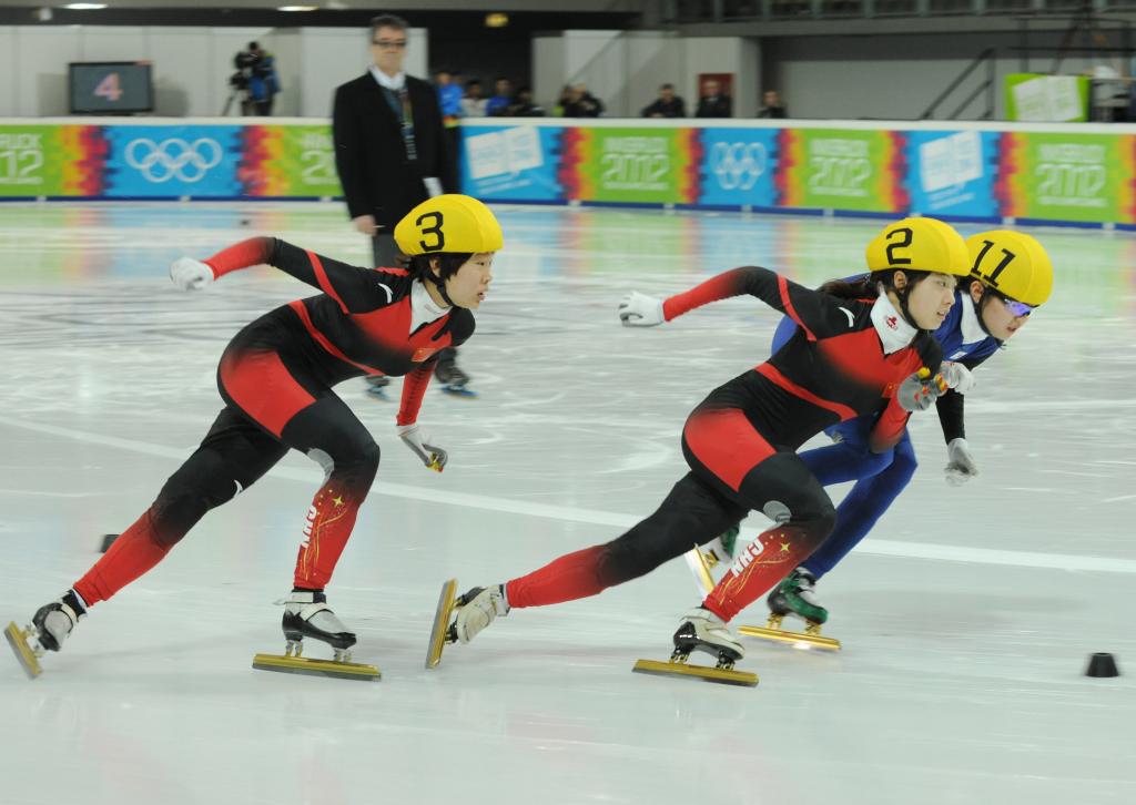 2012年1月19日,曲春雨(左二)在2012年冬青奧會短道速滑女子500米決賽中。新華社記者 徐亮 攝