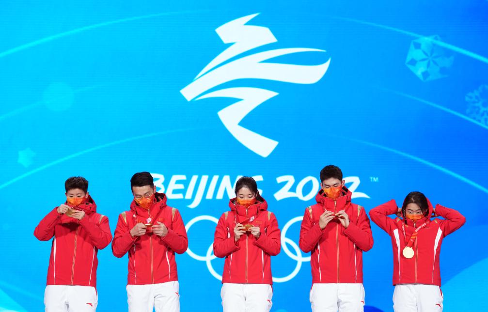 2022年2月6日,范可新、任子威、曲春雨、武大靖、張雨婷(從左至右)在北京2022年冬奧會短道速滑混合團體接力獎牌頒發儀式上。新華社記者 鞠煥宗 攝