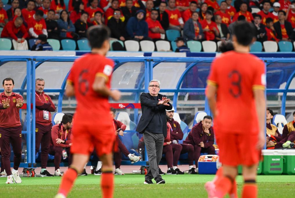 2024年11月19日,中國隊主教練伊萬科維奇(中)在場邊指揮。當日,在福建廈門舉行的2026美加墨世界杯亞洲區預選賽18強賽第六輪比賽中,中國隊主場1:3不敵日本隊。新華社記者 姜克紅 攝