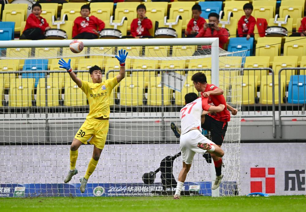 11月2日,成都蓉城隊球員董巖鋒(右)在2024賽季中國足球協會超級聯賽第30輪比賽中頭球破門。新華社發(尹鋼攝)