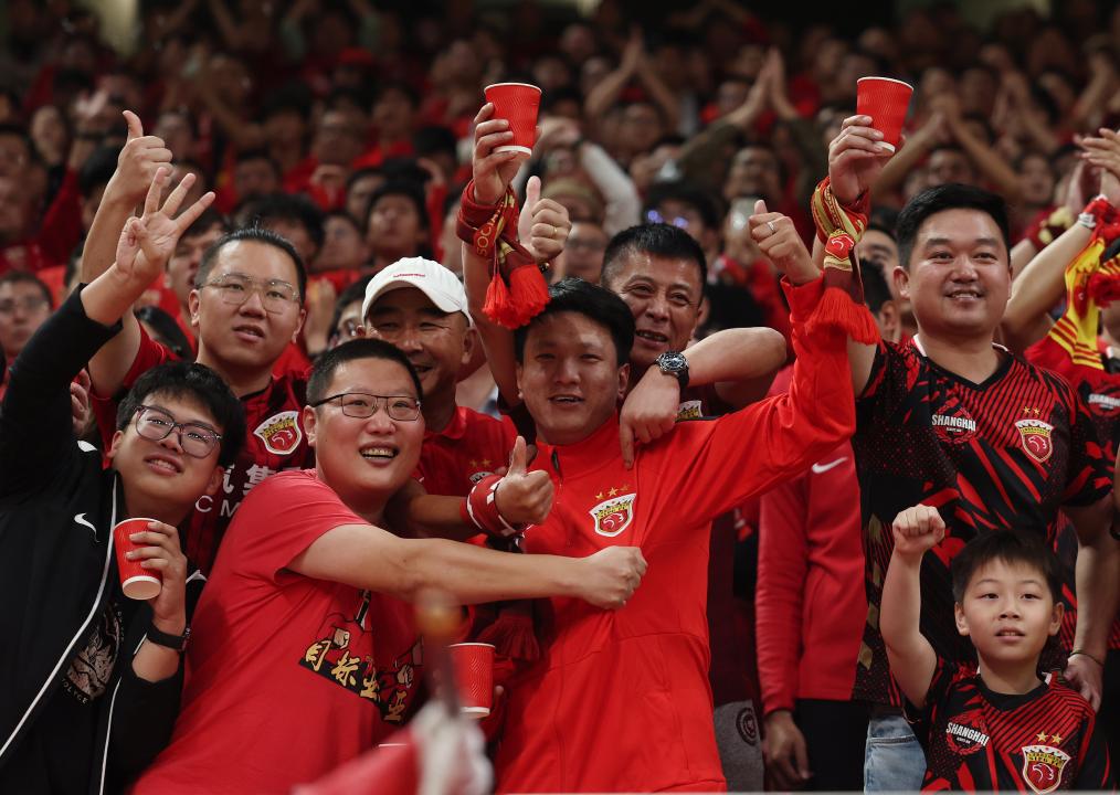 11月2日,上海海港隊球迷慶祝本隊得分。當日,在2024賽季中國足球協會超級聯賽最后一輪比賽中,上海海港隊主場5:0戰勝天津津門虎隊,衛冕中超聯賽冠軍。新華社記者 賈浩成 攝