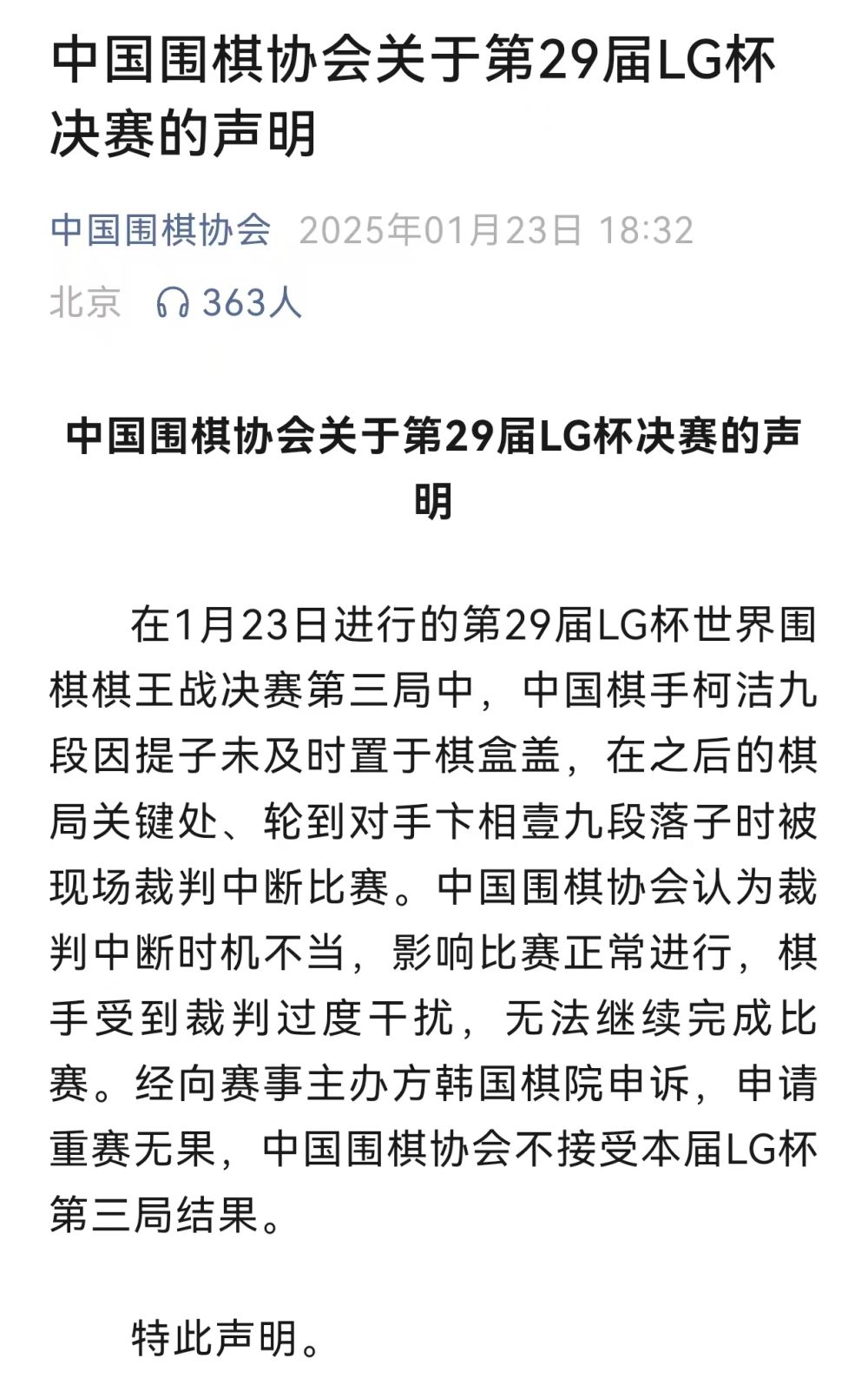 新華社北京1月24日電(記者王鏡宇、鄭直)在第29屆LG杯世界圍棋棋王戰三番棋決賽的后兩局連續出現戲劇性的場面。中國棋手柯潔因為未將提掉的對方“死子”放入棋盒蓋反復被罰,決勝局裁判介入比賽的時機也有爭議,最終柯潔憤而退賽。中國圍棋協會認為,柯潔受到了裁判的過度干擾,不接受決勝局的比賽結果。