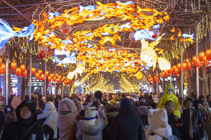 “大吉大利”“國泰民安”“蒸蒸日上”……除夕夜,在哈爾濱中央大街,寫有祝福語的大紅燈籠高高懸掛,錦鯉造型的花燈栩栩如生,美不勝收。游客們紛紛駐足觀賞,許下新年心愿。