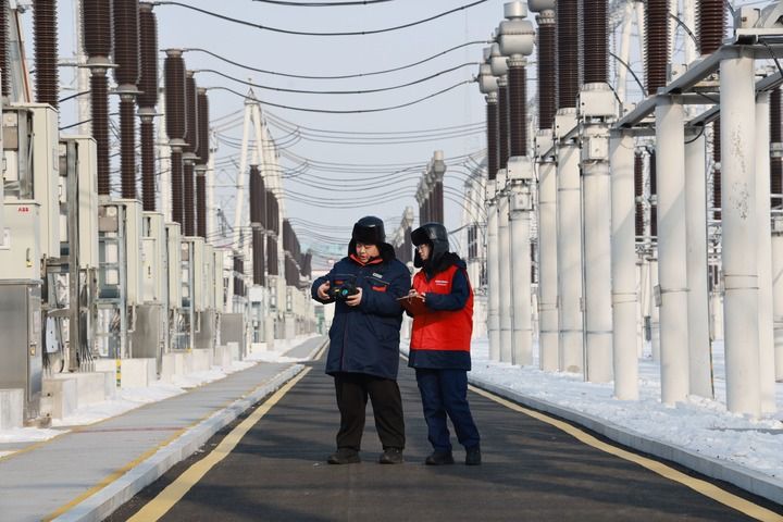 在距離亞冬會開幕式場館30公里外的500千伏哈南變電站,國網黑龍江電力工作人員進行巡檢工作(2025年1月27日攝)。新華社發(何炳華攝)