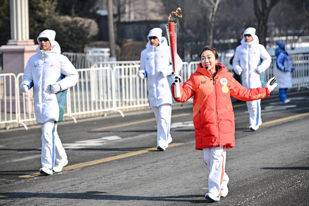 2月3日,火炬手隋文靜在傳遞火炬。新華社記者 江漢 攝
