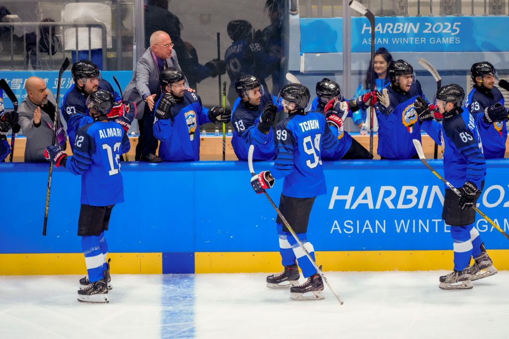2月3日,科威特冰球隊球員在比賽中慶祝進球。新華社記者 王建威 攝