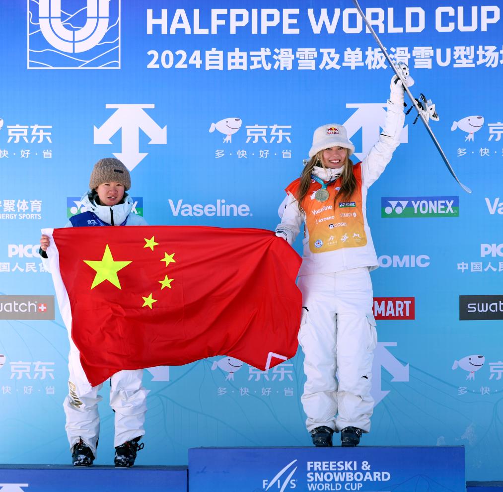 2024年12月7日,在河北張家口崇禮云頂滑雪公園舉行的2024-2025賽季國際雪聯自由式滑雪U型場地技巧世界杯崇禮站女子組比賽中,冠軍中國選手谷愛凌(右)和亞軍中國選手李方慧在頒獎儀式上。新華社記者 雒圓 攝