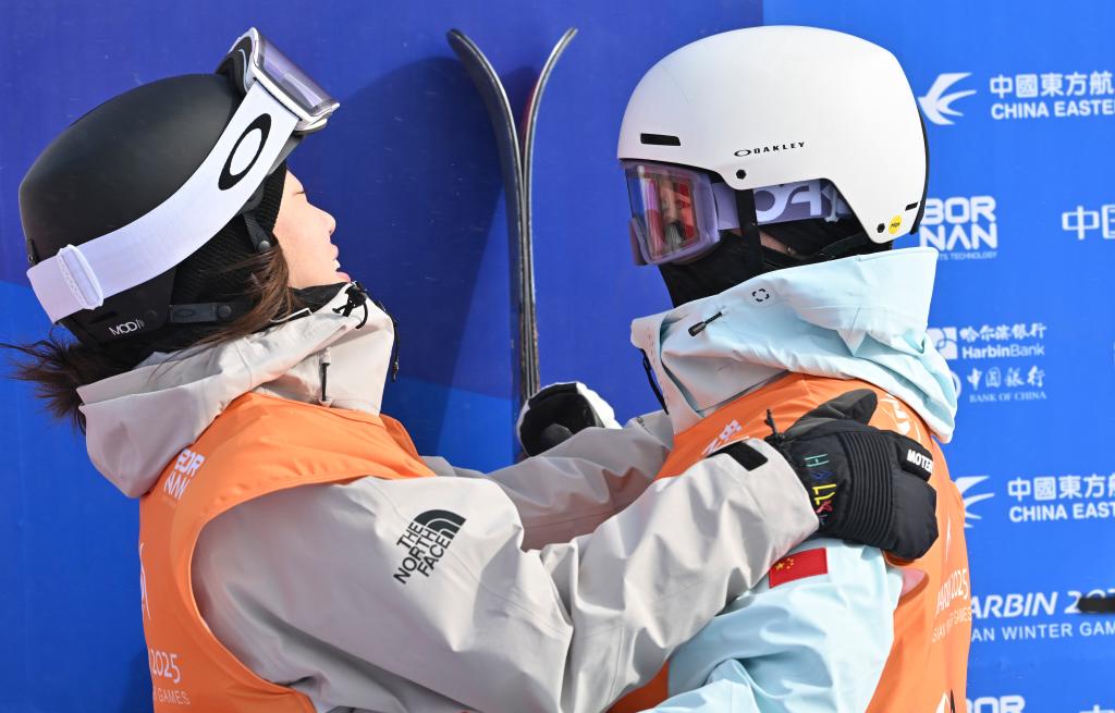 2月8日,李方慧(右)在第九屆亞冬會自由式滑雪女子U型場地技巧比賽后與張可欣互相祝賀。新華社記者 楊晨光 攝