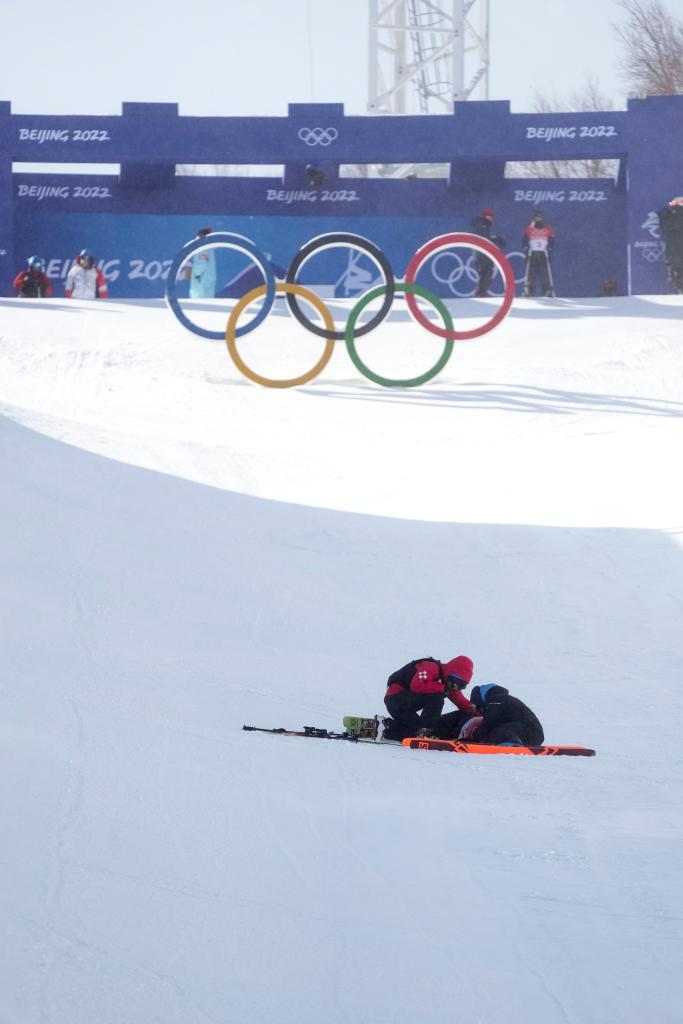 2022年2月18日,在北京2022年冬奧會自由式滑雪女子U型場地技巧決賽上,中國隊選手張可欣受傷后接受醫療救治。新華社記者 王昊飛 攝