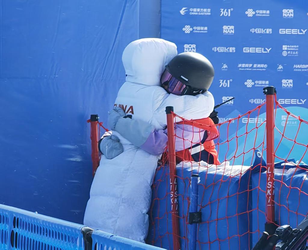 賽場突然風雪加大,韓林杉在看到成績后,快速滑進通道,隔著護欄和李治久久擁抱。