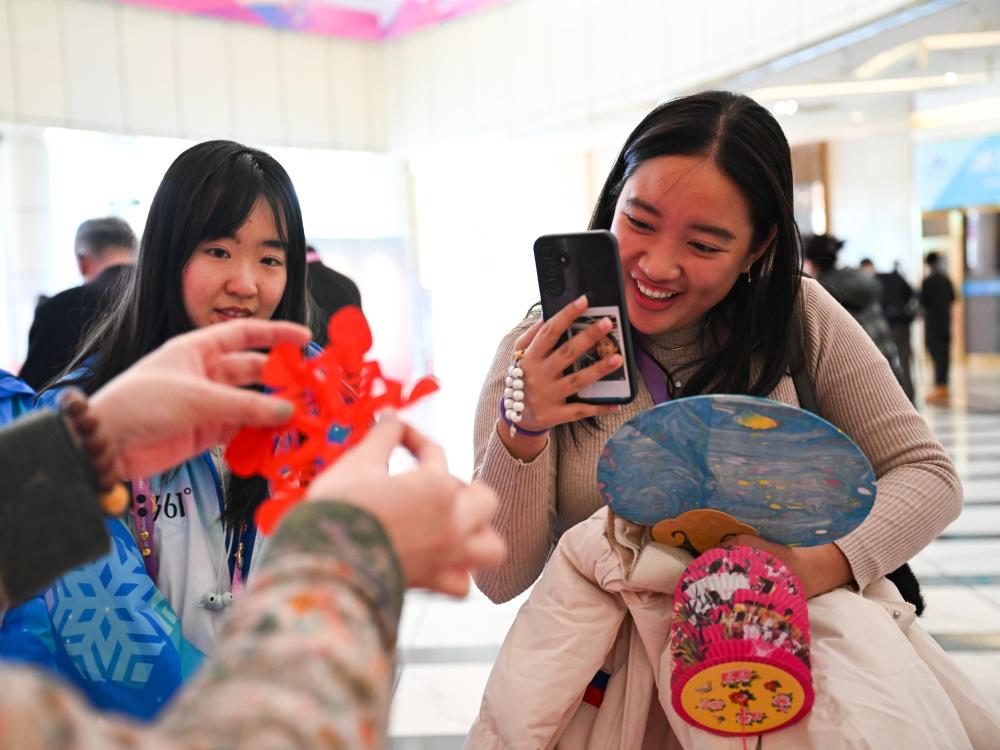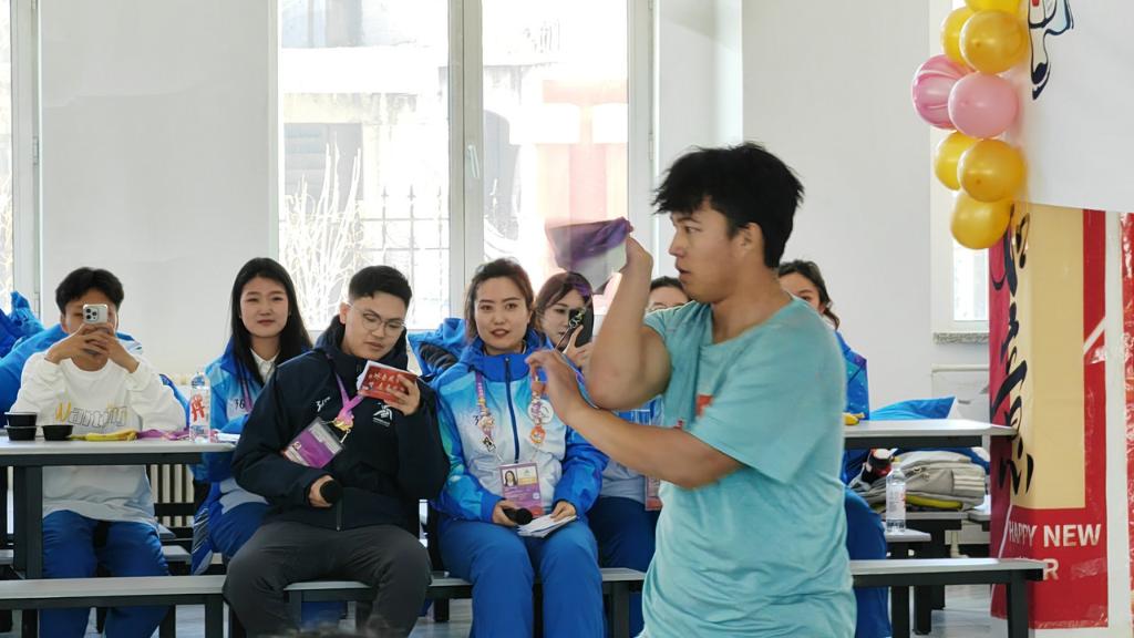 冰雪世界熱熱鬧鬧,運動員村喜氣洋洋。在運動員村一樓大廳,以元宵節為主題的非遺展演吸引不少運動員和隨隊官員駐足體驗。冰版畫、方正剪紙、龍頭蜈蚣風箏制作等黑龍江特色非遺,與蛇年生肖、亞冬會吉祥物、雪花等形象巧妙結合,讓來自各地的賓客了解中華傳統文化,帶走一份珍貴記憶。