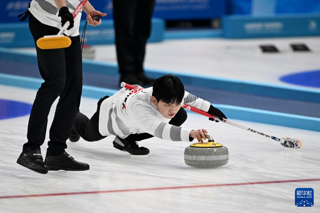 2月13日,韓國隊選手李在秉在比賽中擲壺。