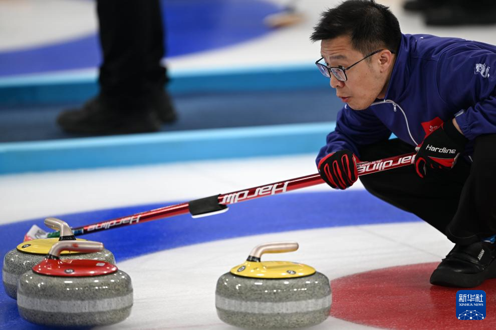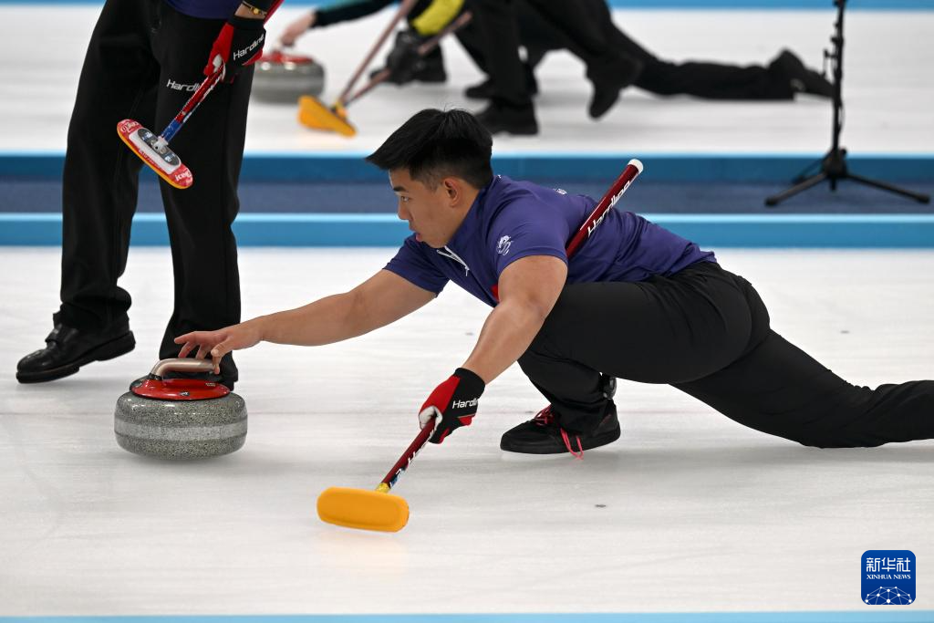 2月13日,中國香港隊選手鄭政楠在比賽中擲壺。