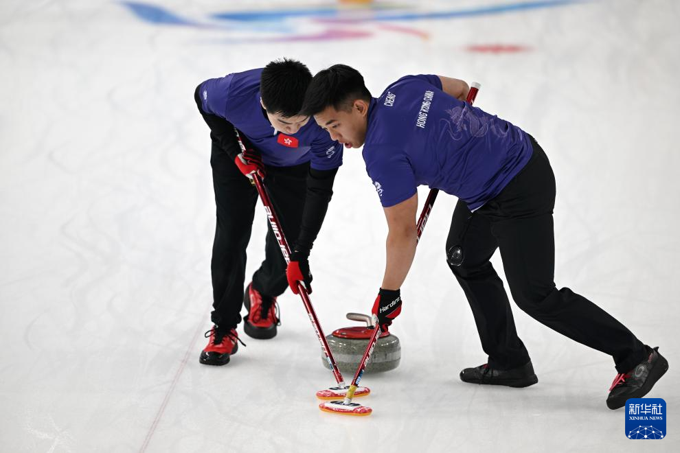 2月13日,中國香港隊選手鐘卓熙(左)在比賽中擲壺。