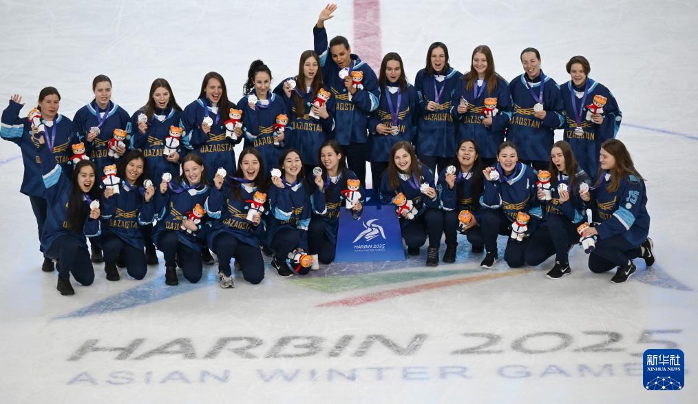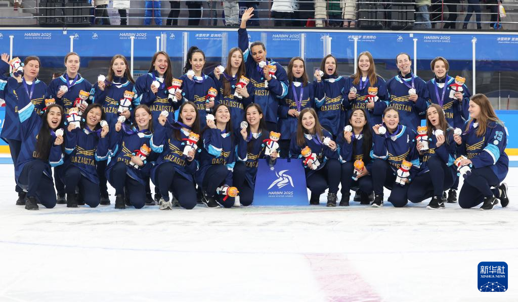 2月14日,亞軍哈薩克斯坦隊在頒獎儀式后合影。