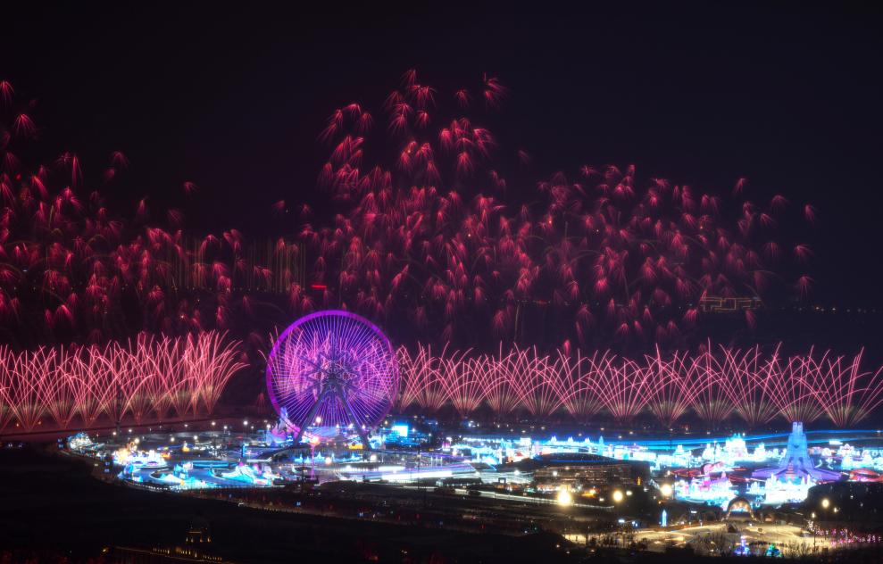 2月7日,焰火在哈爾濱第九屆亞冬會開幕式分會場上空綻放。新華社記者 孫非 攝