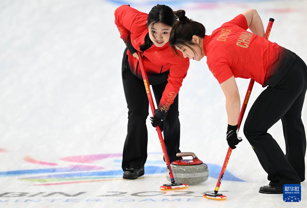 2月13日,中國隊選手姜嘉怡(下)在比賽中擲壺。